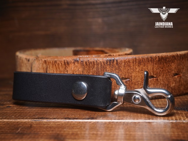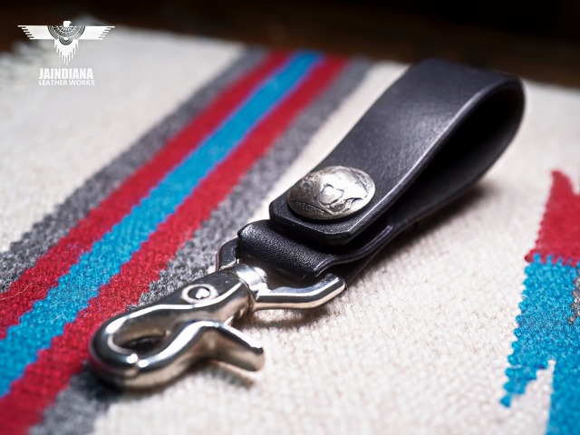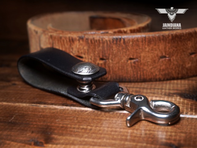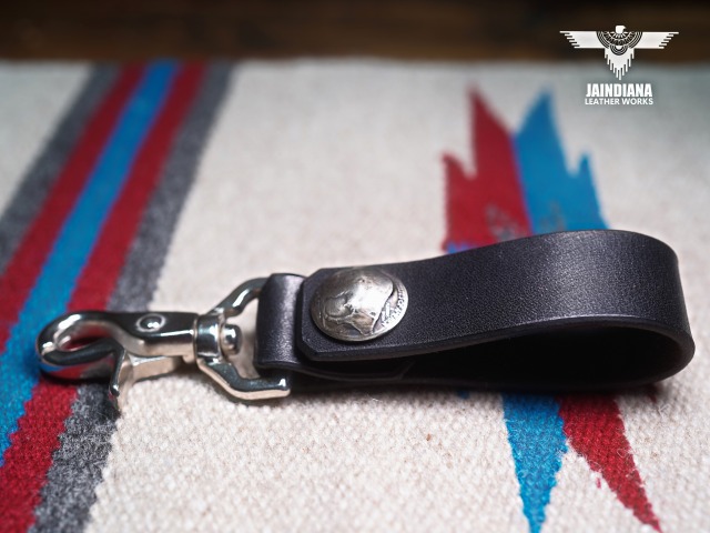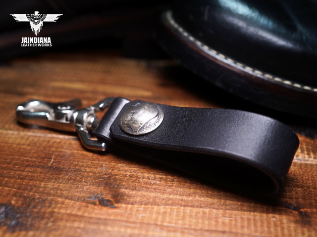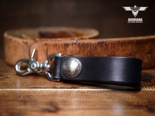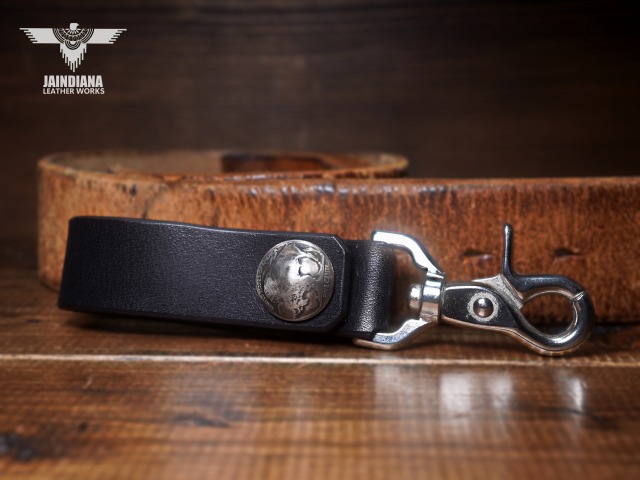 説得力のあるブラックサドルレザーが不動の存在感を放つベルトループキーホルダー。重厚感あるナスカンを使用し、アメリカ5セントバッファローコインコンチョを取り付けたベルトループキーホルダー。