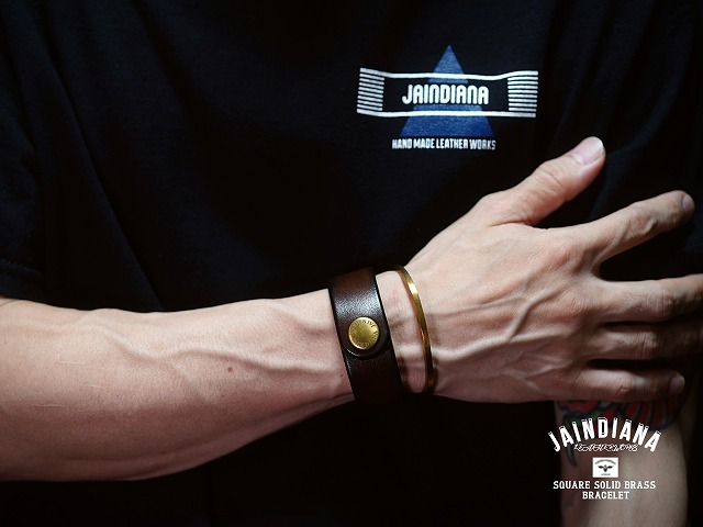 真鍮無垢のバングルは革との相性が抜群で、ビンンテージ染めサドルレザーブレスレットと合わせ付けがおすすめです。
