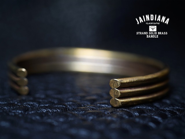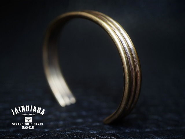 三本の真鍮無垢ラウンドバーを連結して製作したストランドバングル。真鍮無垢のビンテージ感ある風合いと、武骨な素材感が癖になる、バイカースタイルにもカジュアルスタイルにもマッチする真鍮ストランドバングル。
