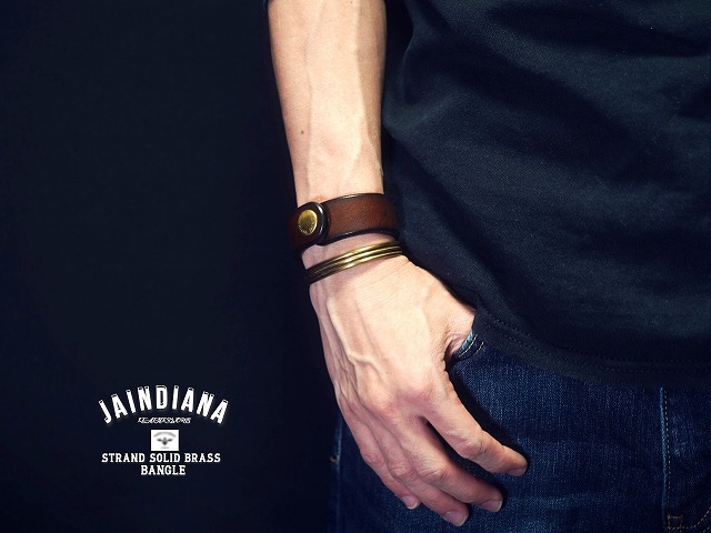 真鍮無垢のストランドバングルは革との相性が抜群で、ビンンテージ染めサドルレザーブレスレットと合わせ付けがおすすめです。