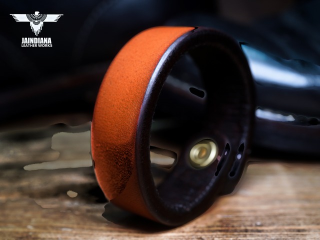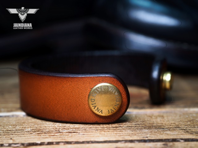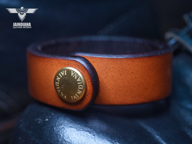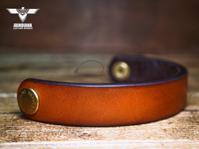 超極厚6oのサドルレザーを手染めでビンテージ感あるライトブラウンに染め上げたレザーブレスレット。牛革本来の圧倒的な存在感を120パーセント味わえる、究極のサドルレザーブレスレット。