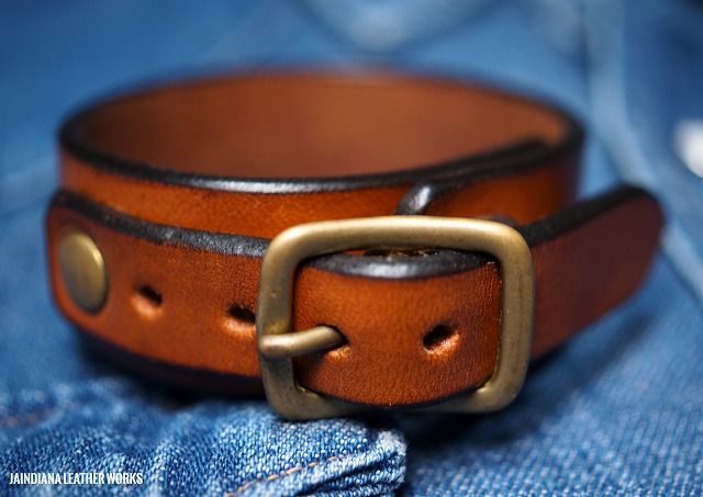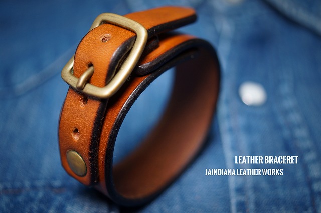 ビンテージ感ある手染めのサドルレザーブレスレットは真鍮バングルとの相性が抜群です。