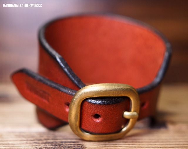 カシメ金具、バックル共に真鍮無垢製を使用しています。