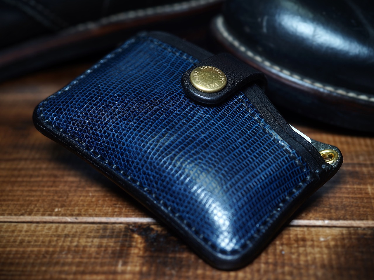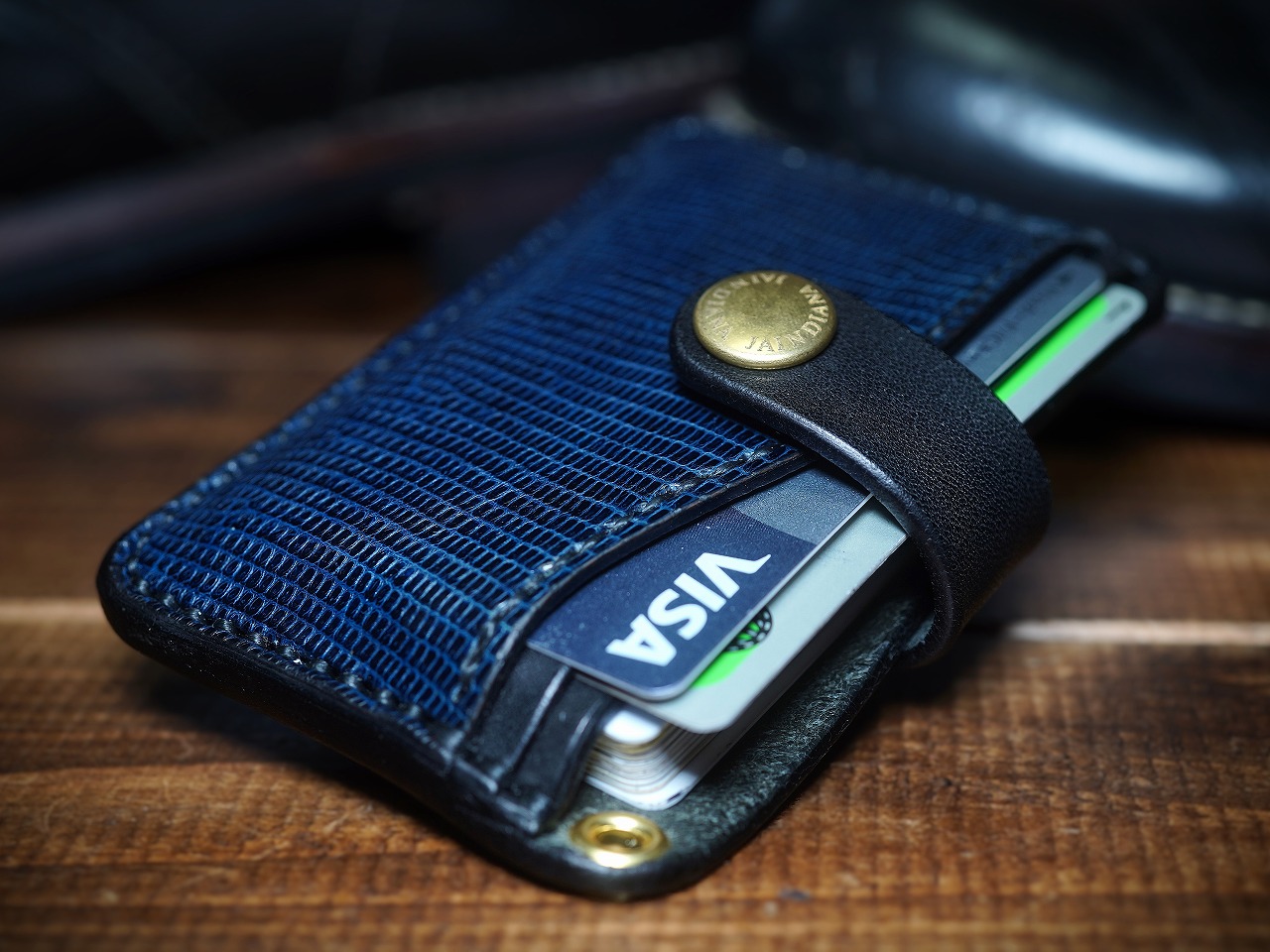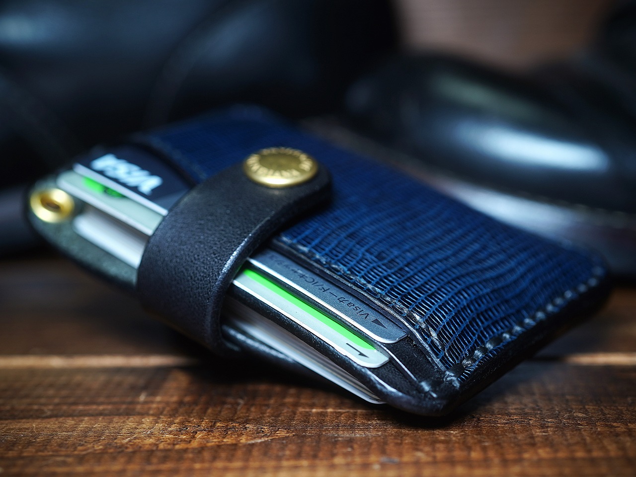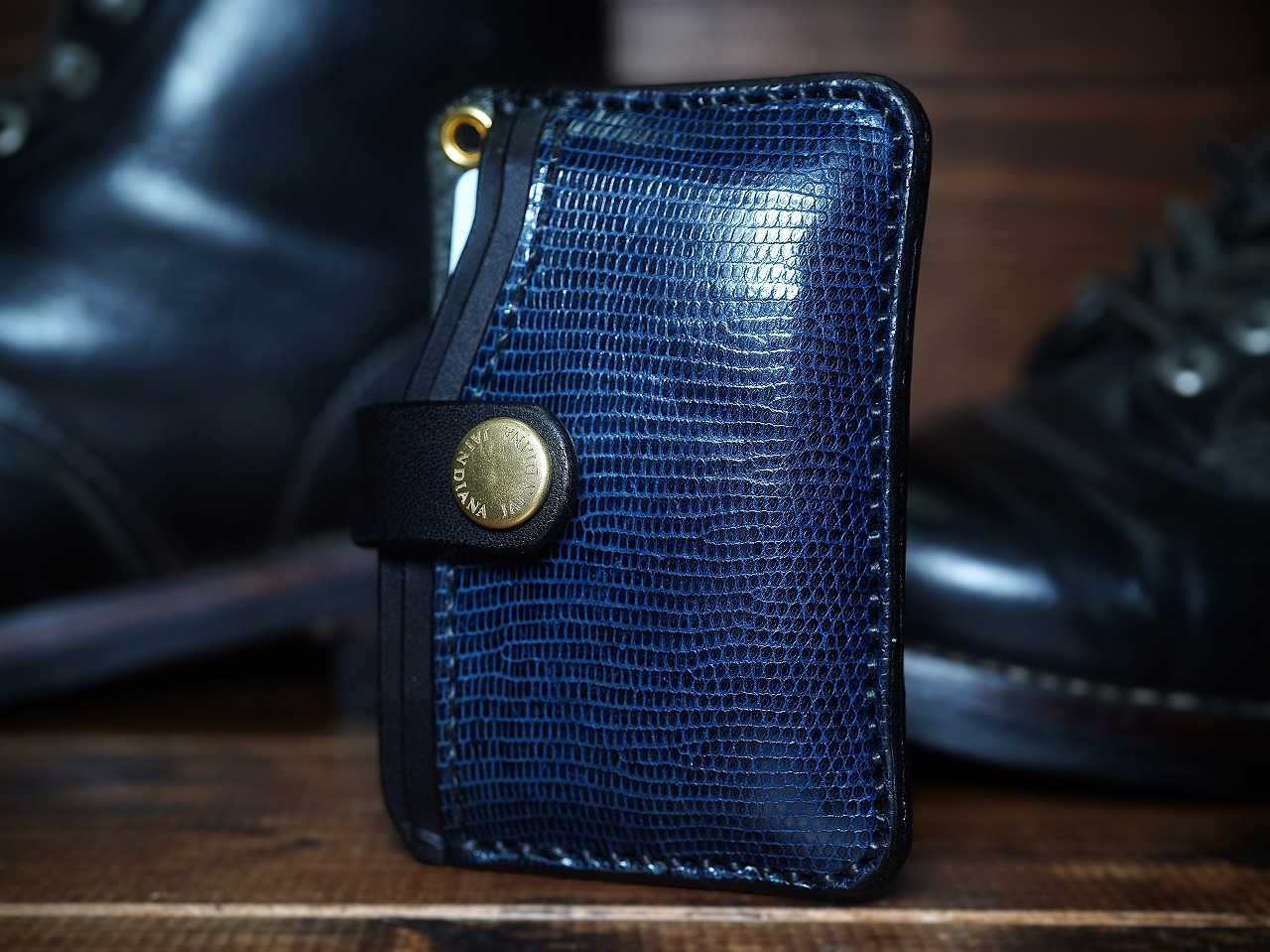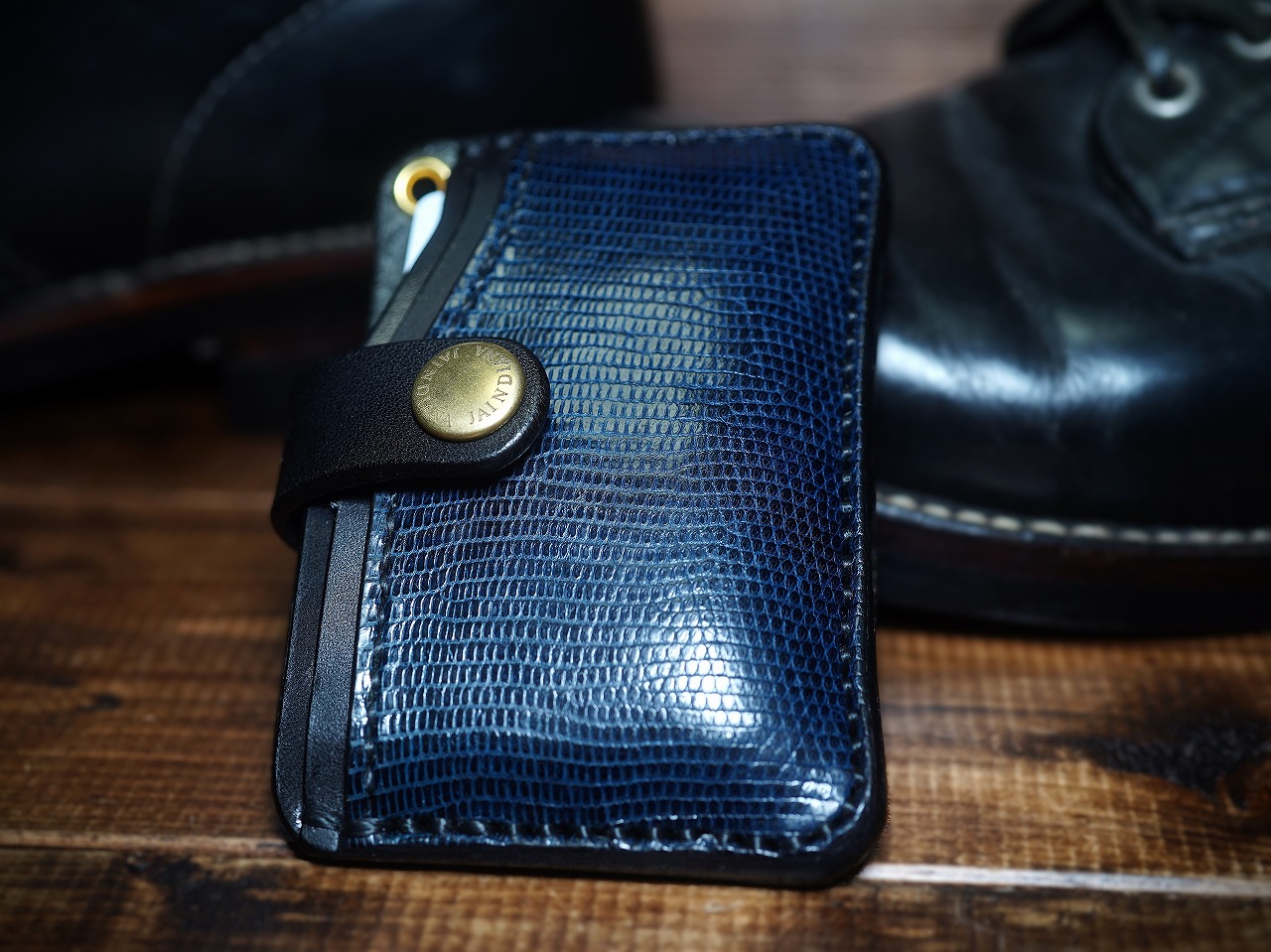 ブラックサドルレザーとダークネイビーのリザードスキン(とかげ革)をコラボしたカードケース。クールな存在感と魅力をコンパクトサイズに落とし込んだ、カード収納力をアップさせたリザードスキンカードケース。