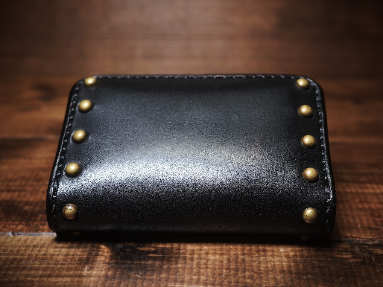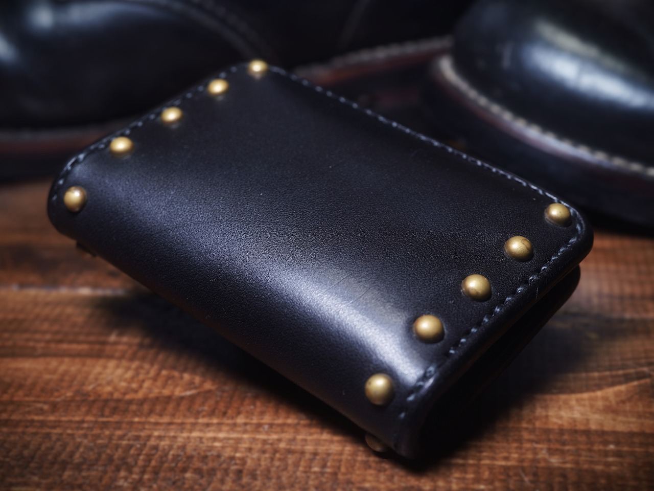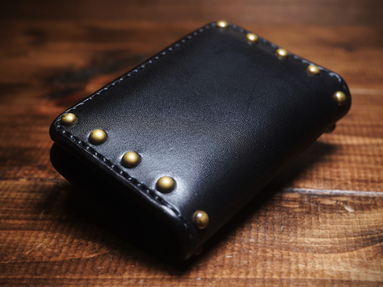 真鍮製のラウンドスタッズを大胆に打ち込み、更に重厚感を増し、個性を身にまとった師玉のカードケース。
