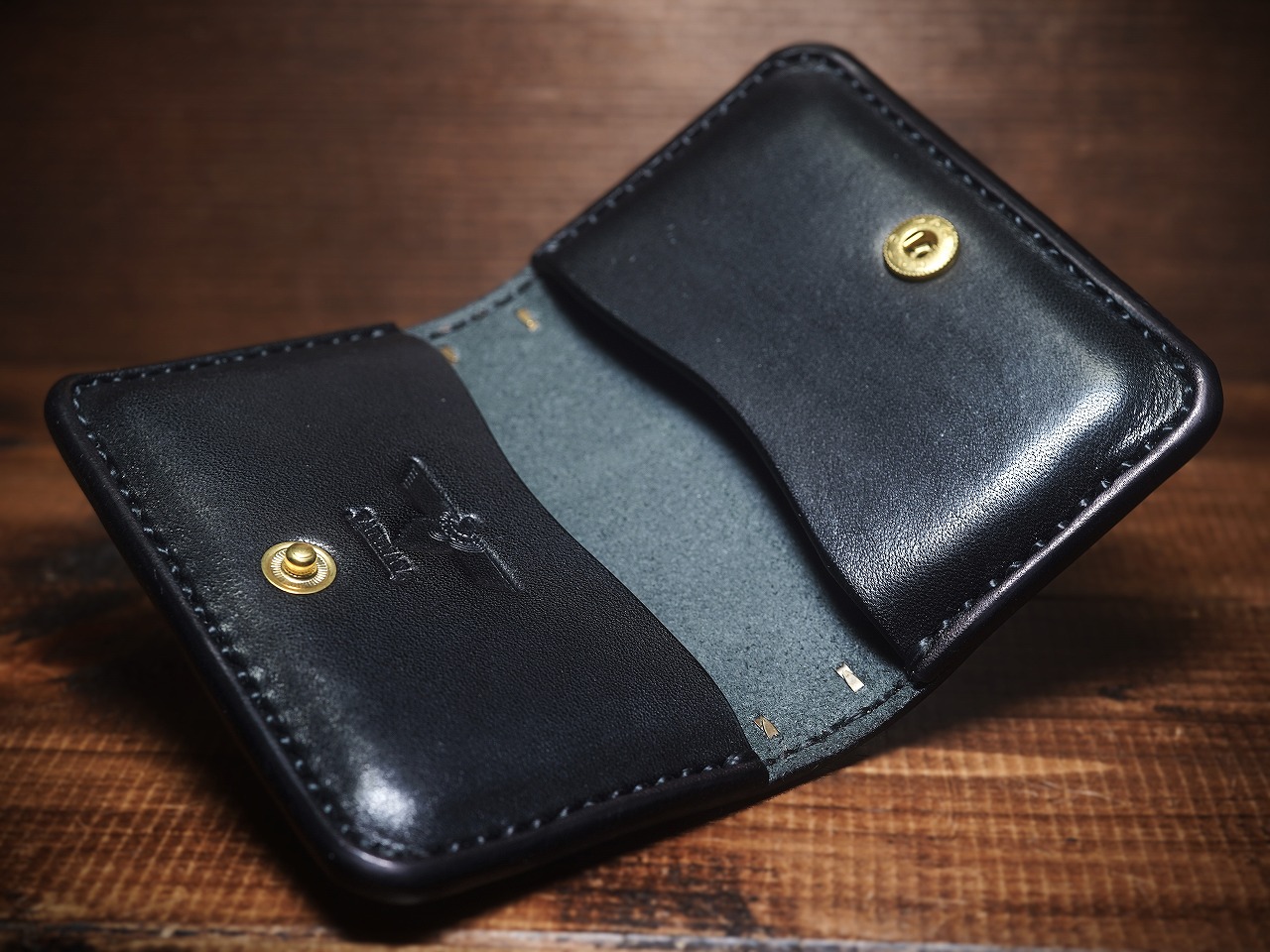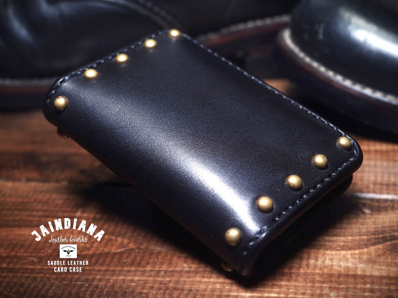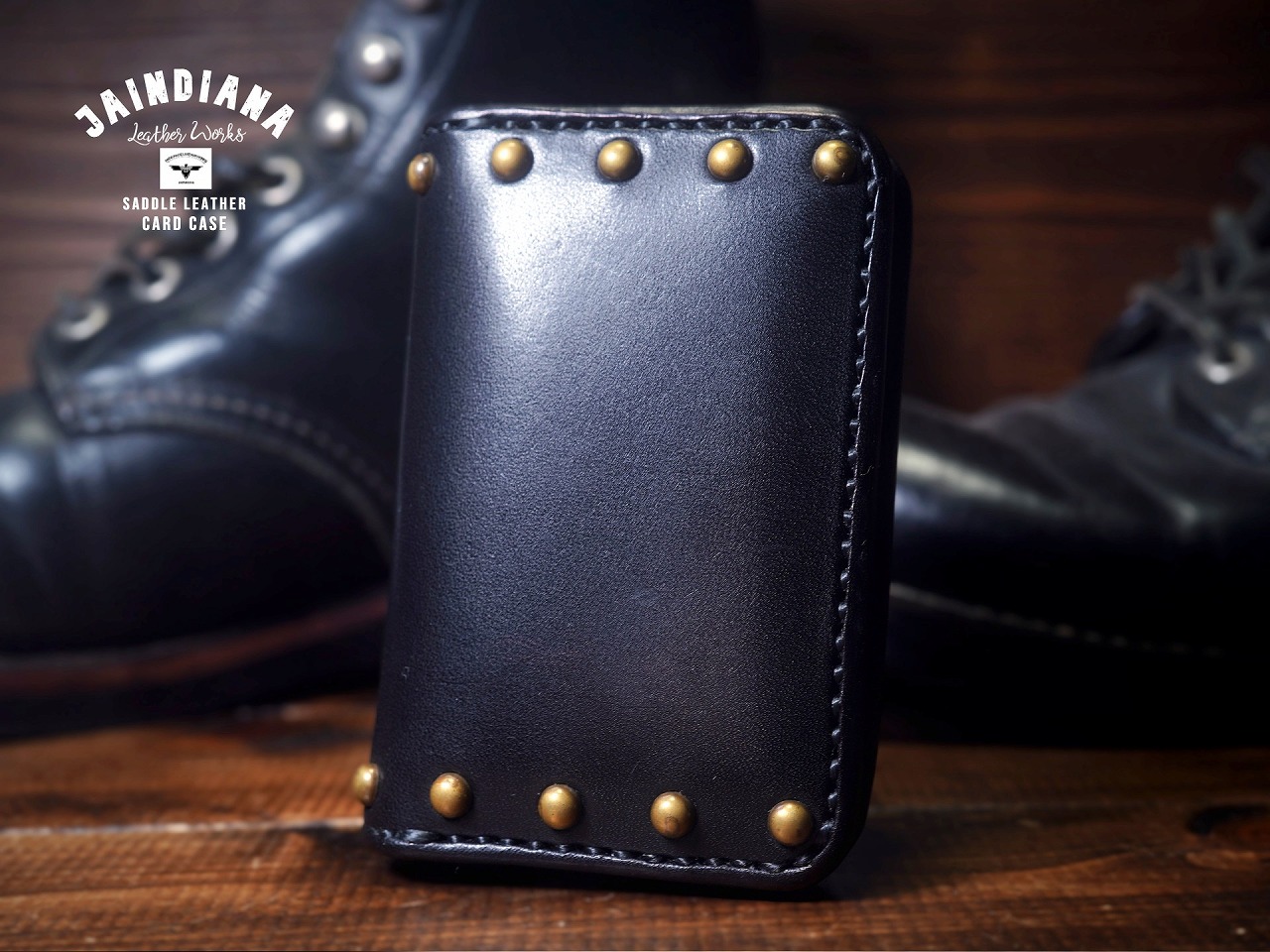 真鍮製のラウンドスタッズを大胆に打ち込み、更に重厚感を増し、個性を身にまとった師玉のカードケース。