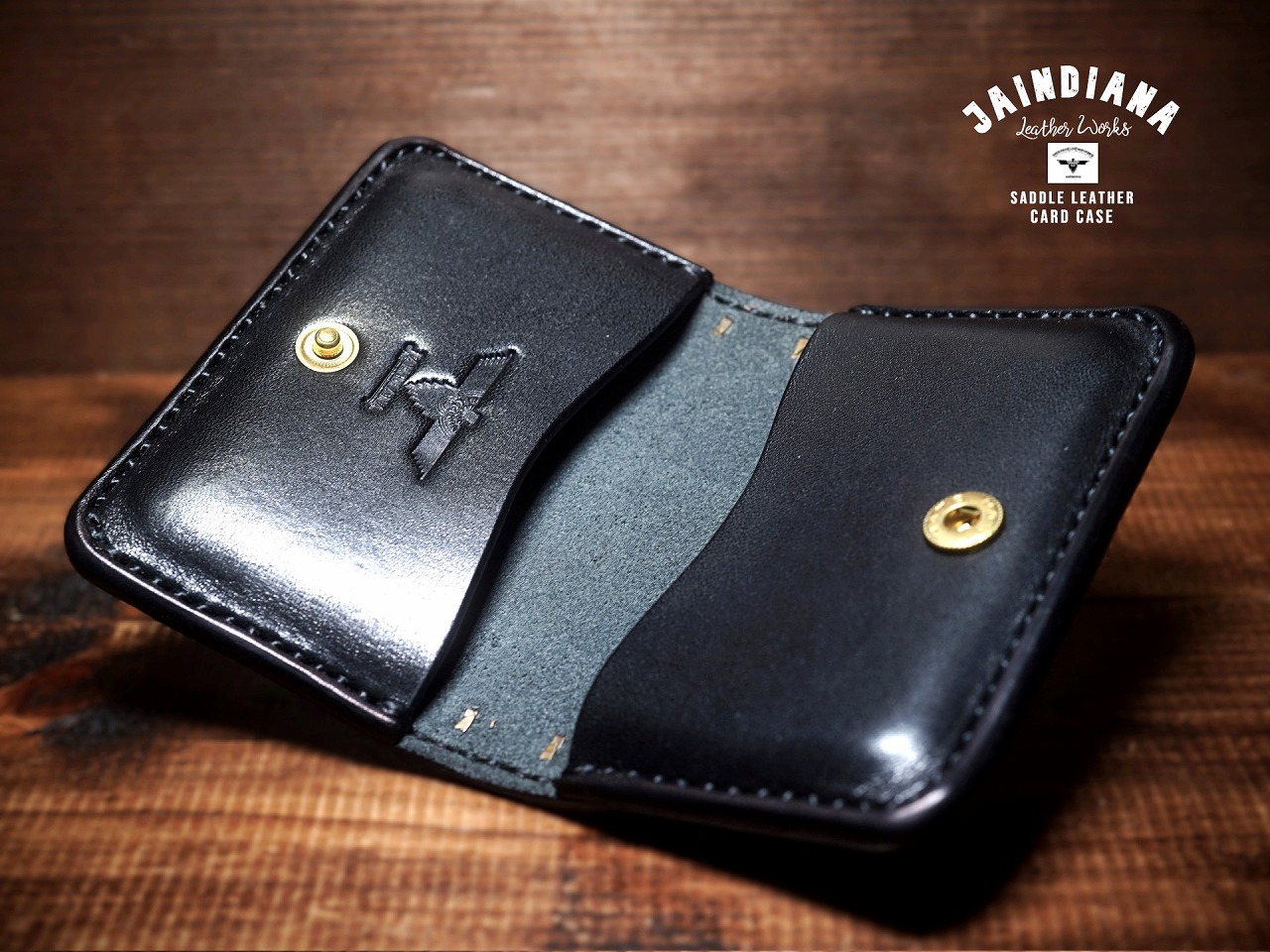 説得力ある重厚感を放つブラックサドルレザーを使用したカードケース。肉厚な本物の革に真鍮製スタッズを打ち込まれ、洗練されたクールさと武骨な存在感を合わせ持つ、お洒落でかっこいい、使い易さも兼ね備えたサドルレザーカードケース。