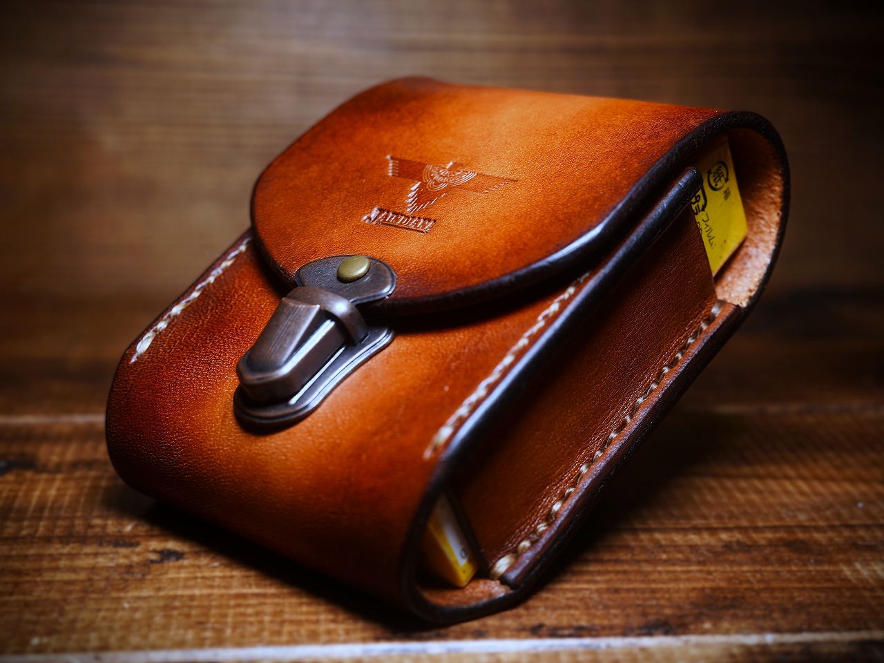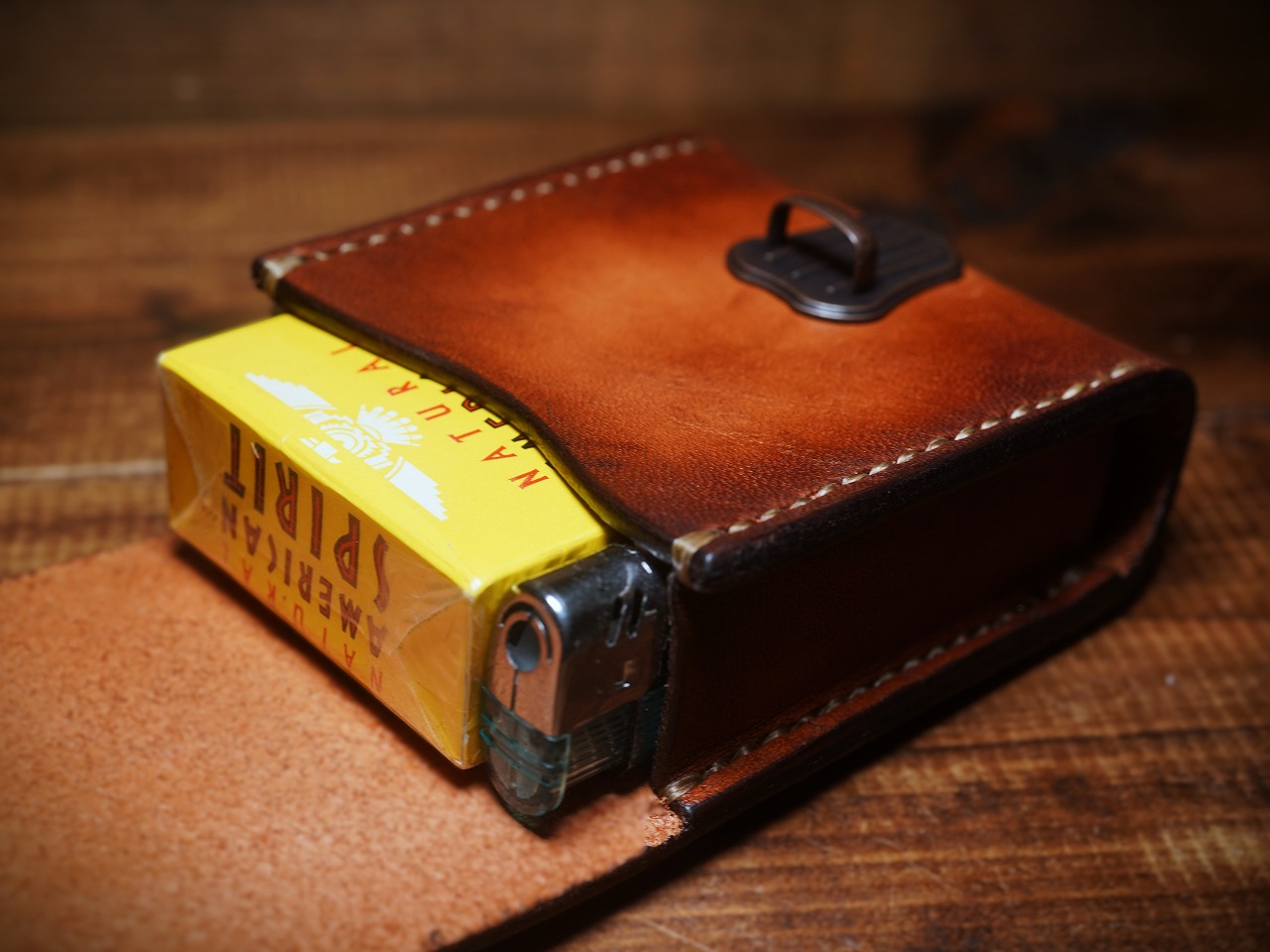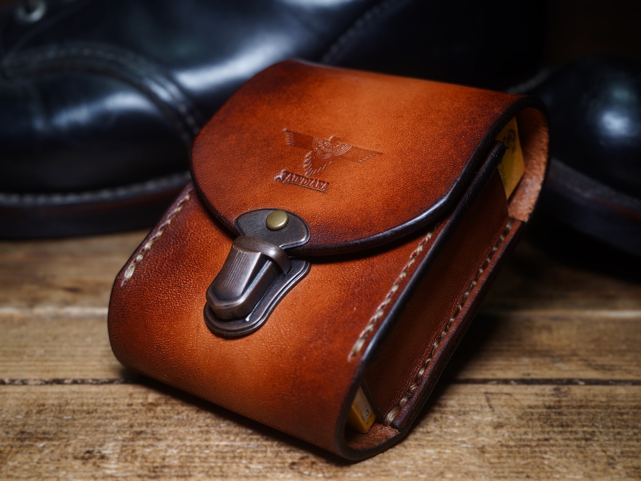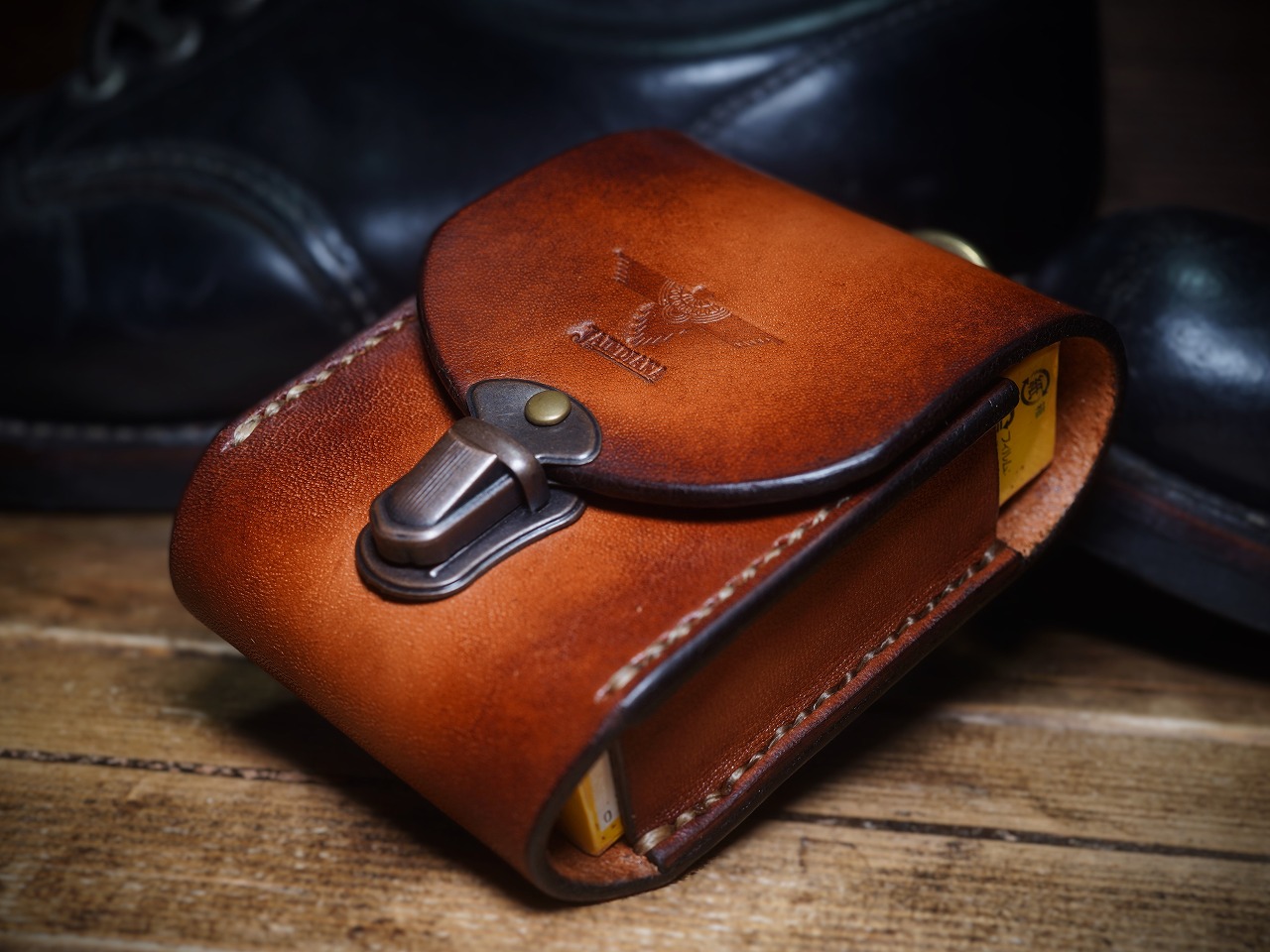 手染めによりビンテージ感漂うライトブラウンに仕上げられたサドルレザーが日常に確かな充足感をもたらす煙草ケース。留め金具には便利な差し込み錠を使用し、利便性とデザイン性を兼ね備えたタバコケース。