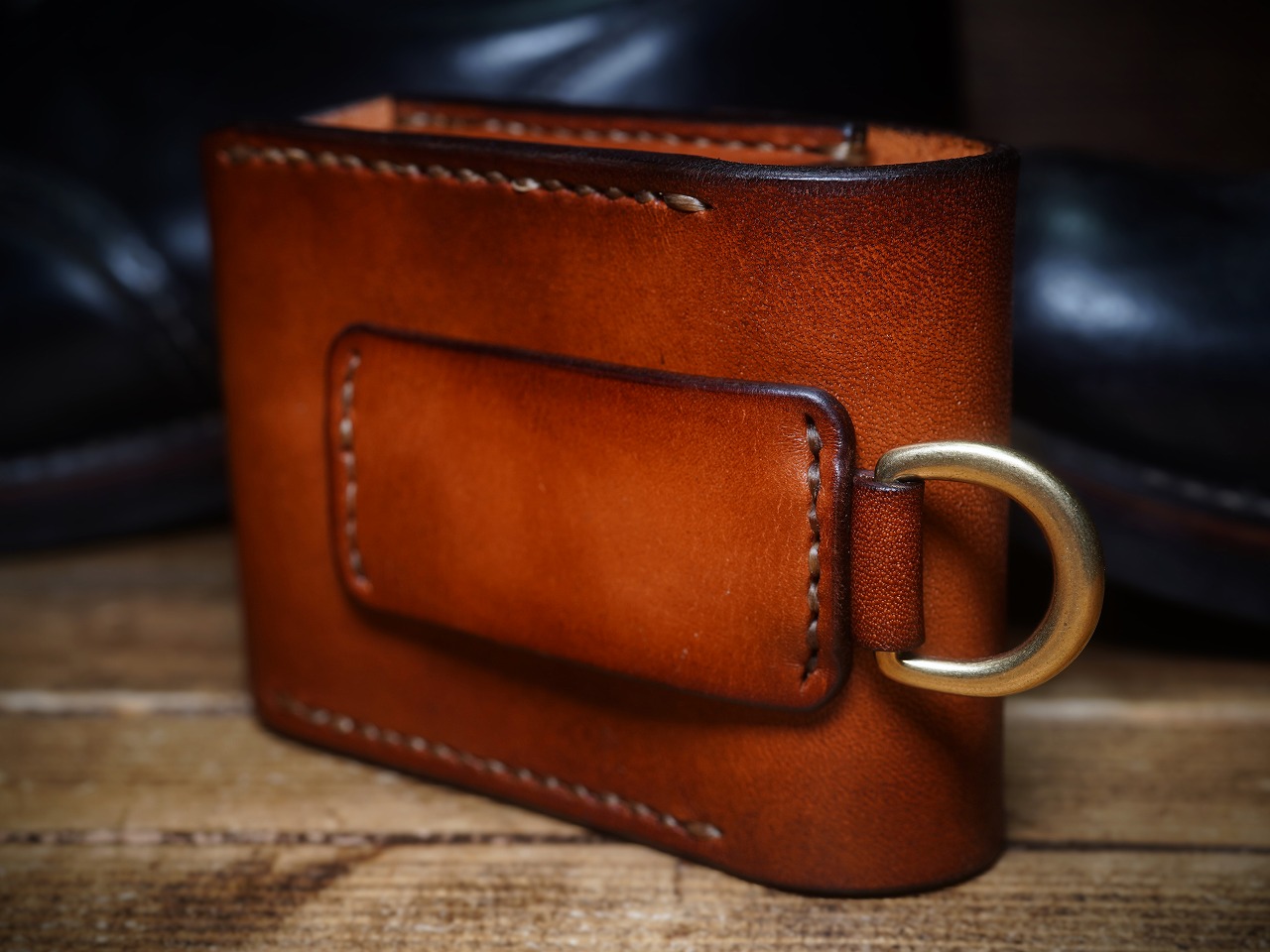 背面には重厚な真鍮製Dカンを取り付けてありますので、ベルトフォルダーなどに取り付けられて便利です。