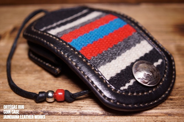 ブラックベースに赤とターコイズブルーのラインがお洒落なオルテガラグをブラックサドルレザーにインレイした小銭入れ。コンパクトサイズが手に馴染む抜群のサイズ感。ネイティブ感漂う使う者に寄り添うコインケース。