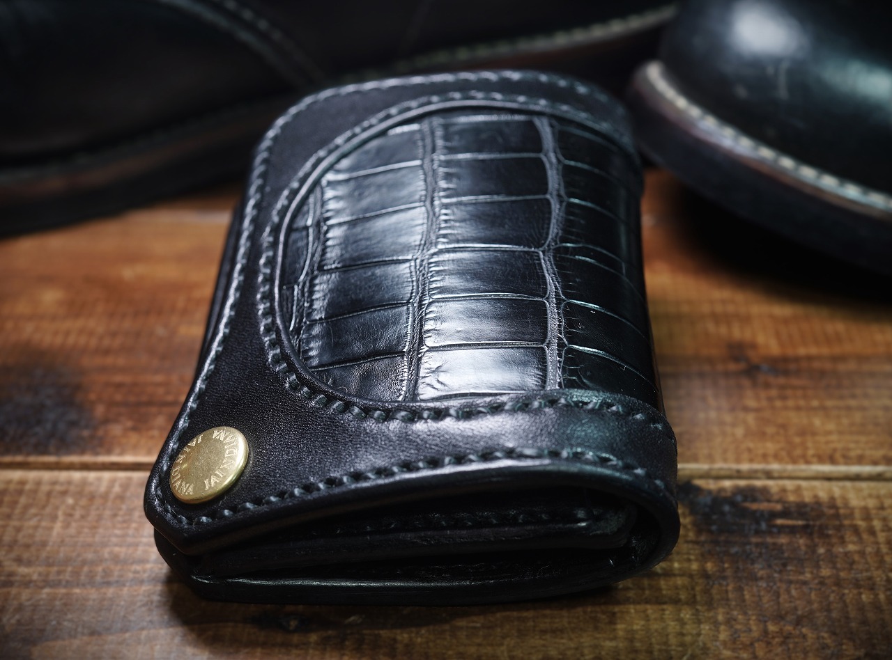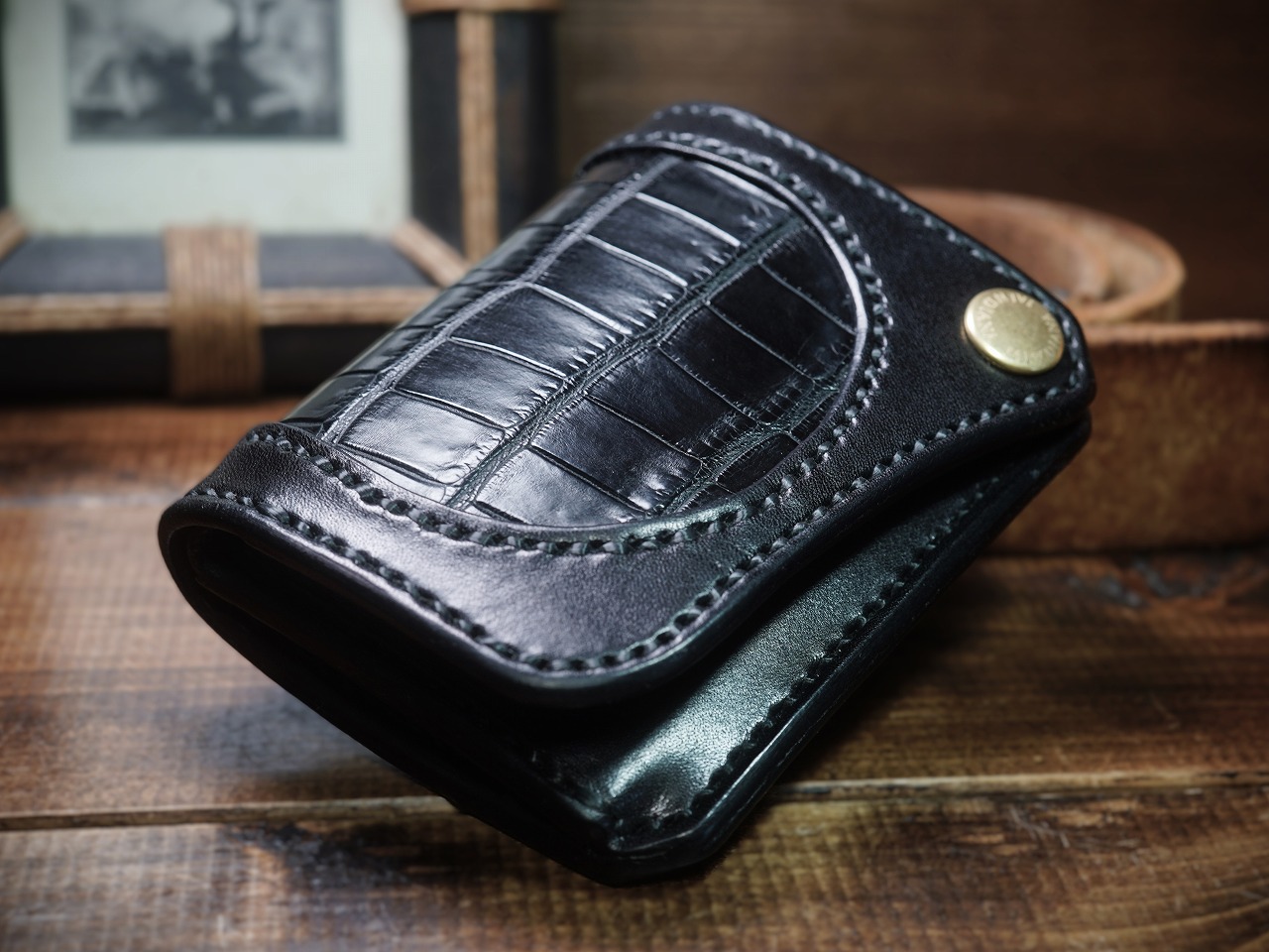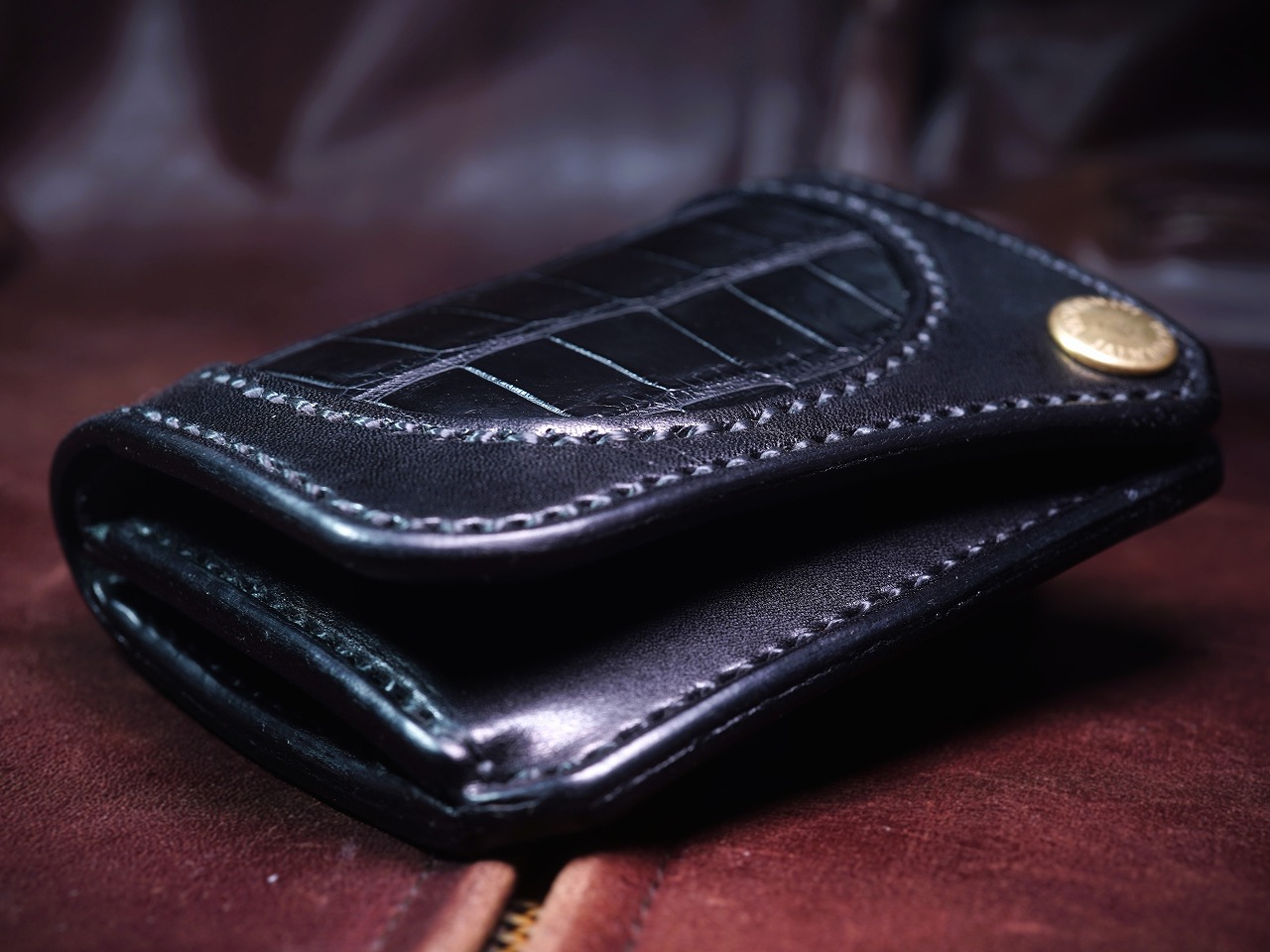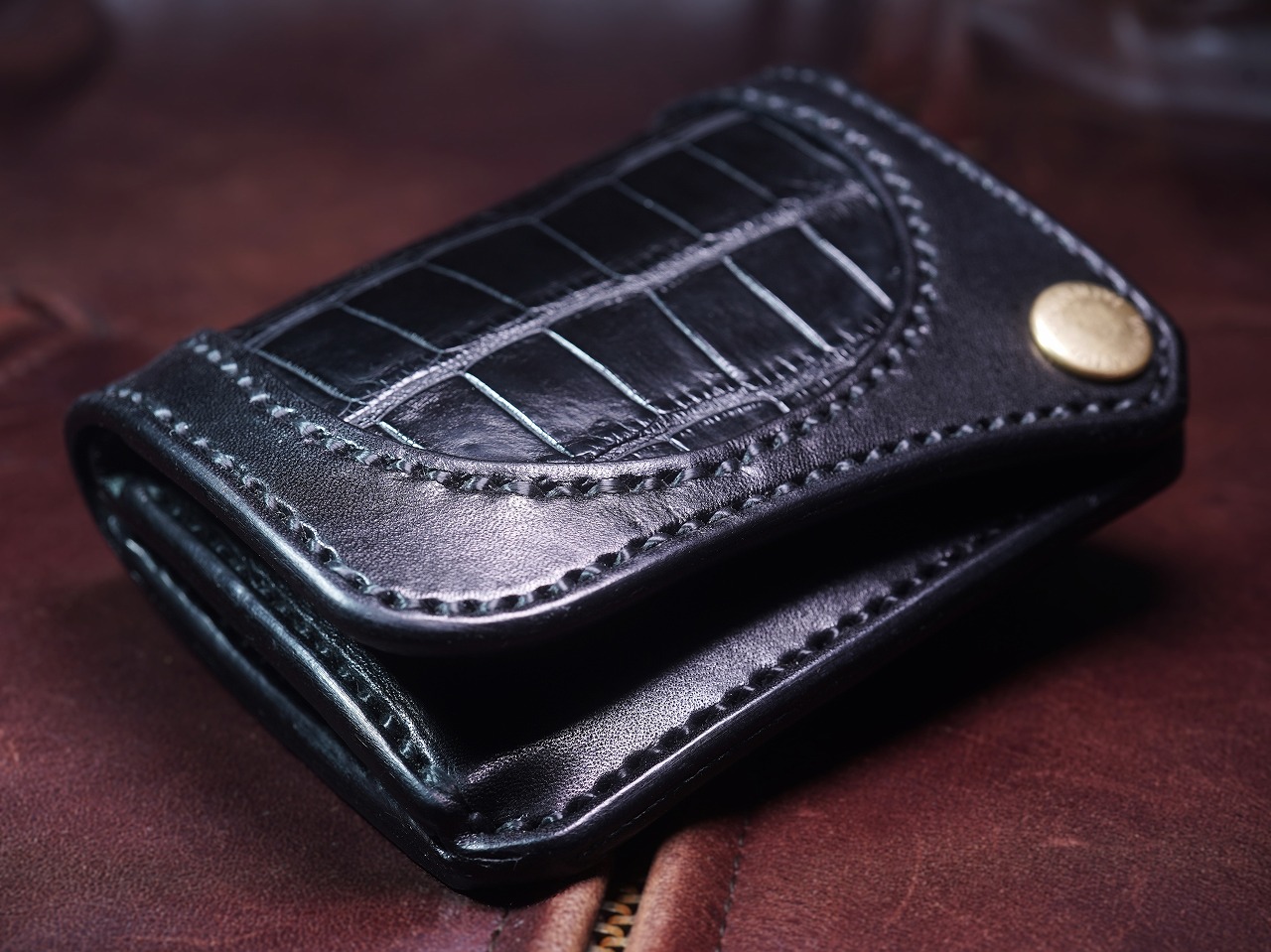 重厚感あるブラックのクロコダイル(鰐革)をコンパクトサイズに落とし込んだウォレット。唯一無二の神秘的で生命力溢れるクロコダイルを屈強な手縫いで構築した、デザイン性と使い易さを兼ね備えたコンパクトウォレット。