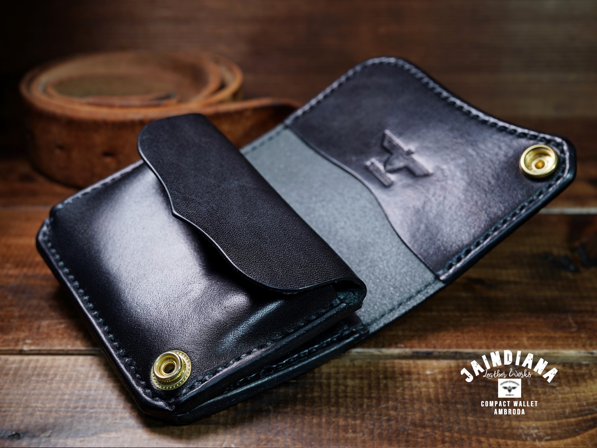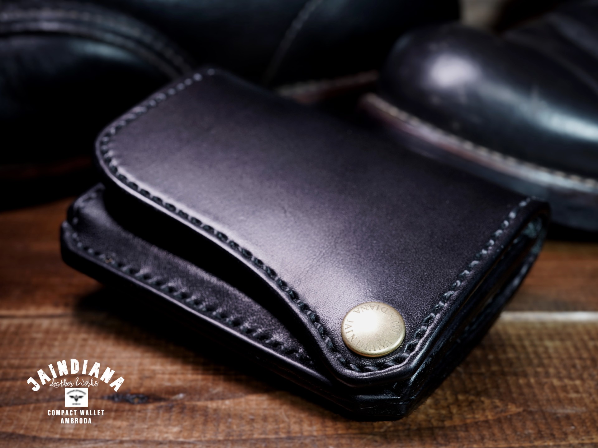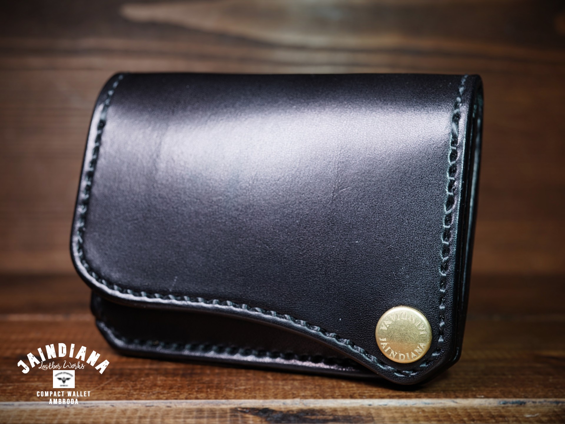 AMBRODA(アンブローダ)モデルのスタンダード。重厚感あるブラックサドルレザーが日常に揺るぎない確かさをもたらすコンパクトウォレット。本物の天然素材を屈強な手縫いで構築した、デザイン性と使い易さを兼ね備えたコンパクトウォレット。