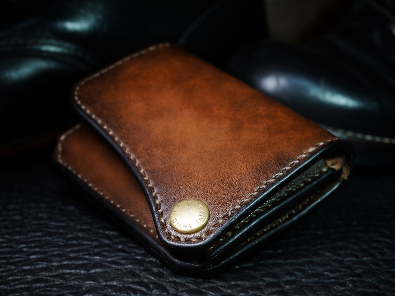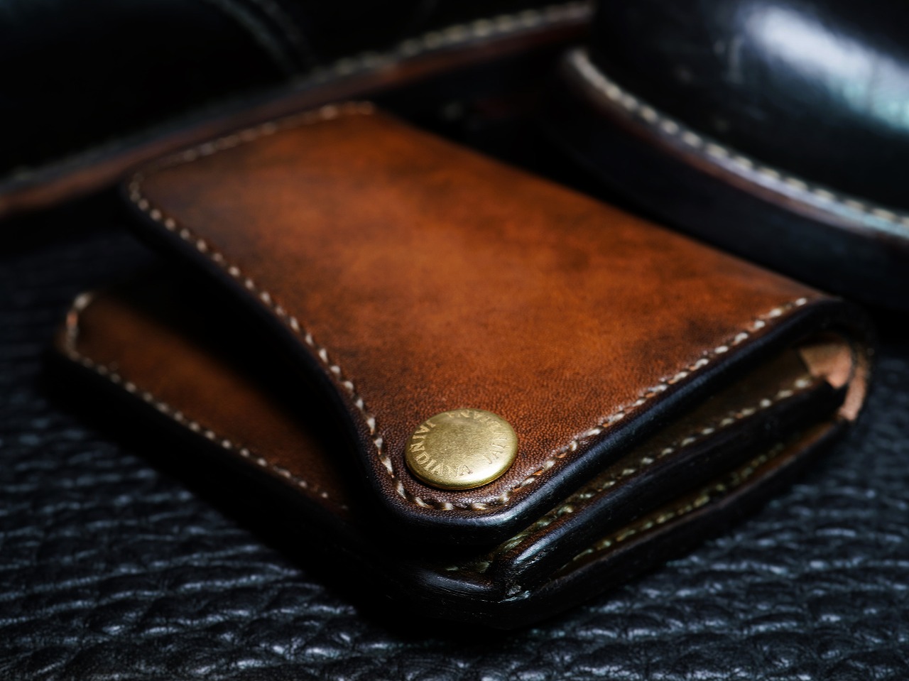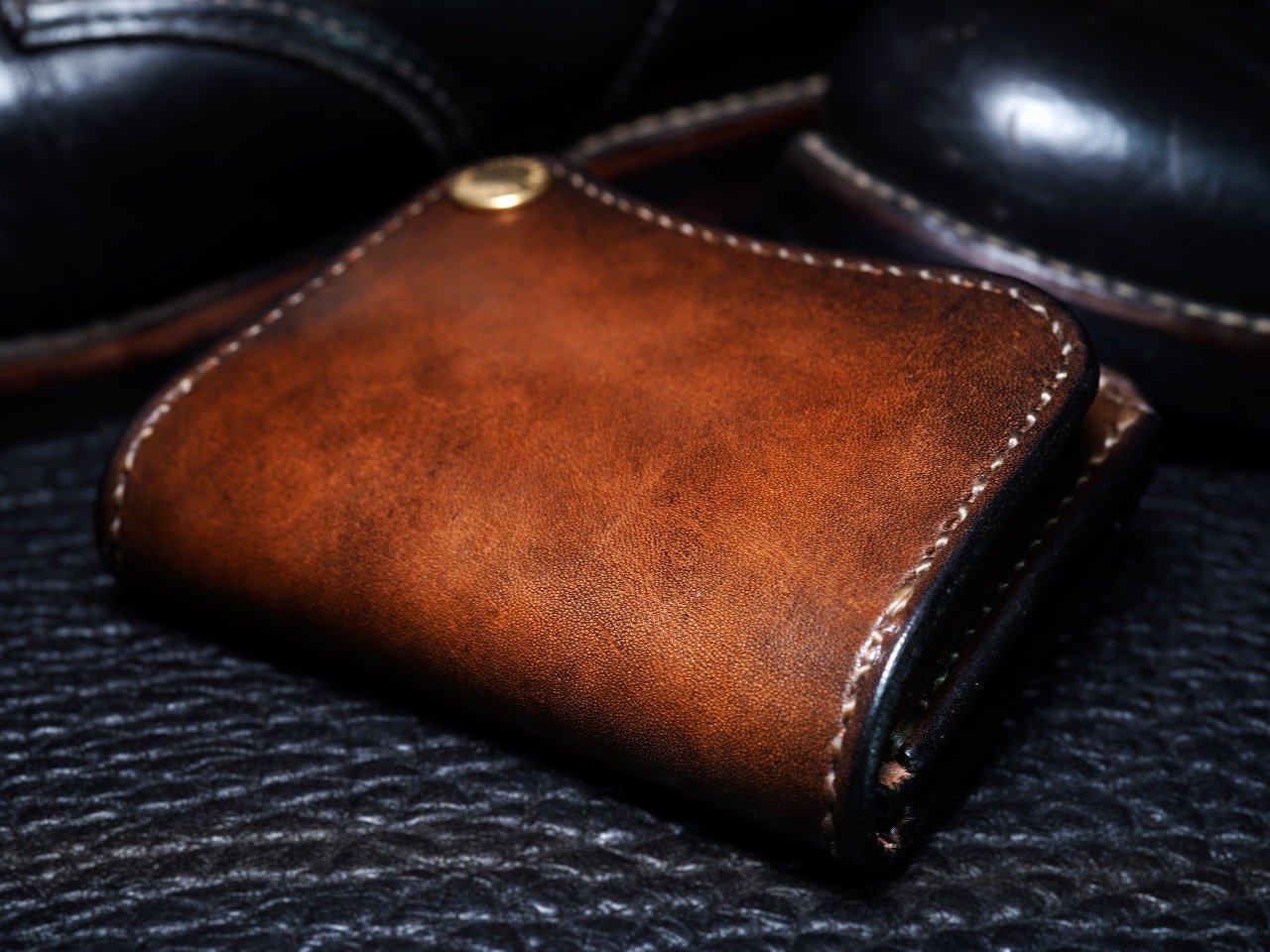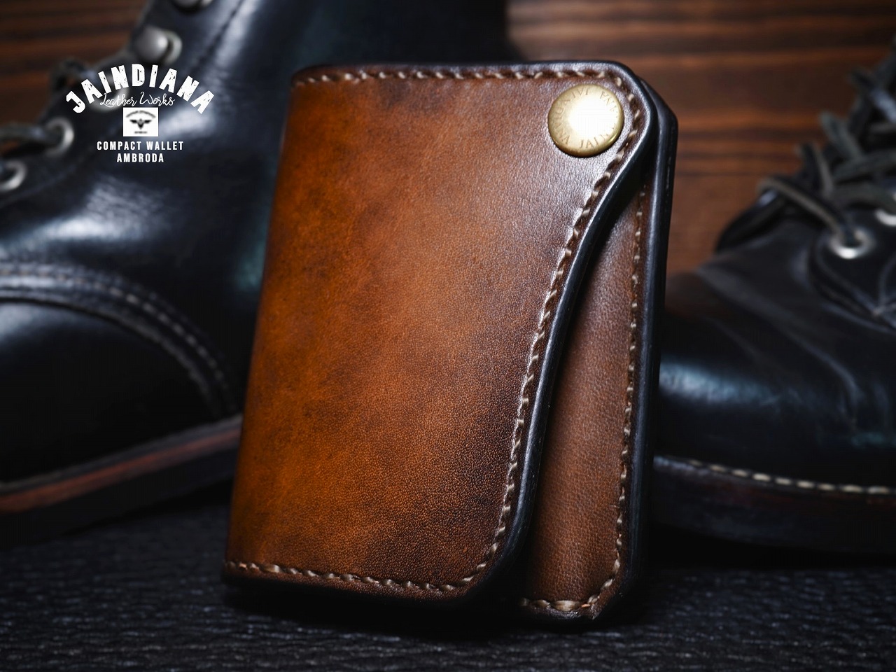 AMBRODA(アンブローダ)モデルの手染めシリーズ。手染めによりビンテージ感あるブラウンに染め上げられたサドルレザーが日常に極上のスパイスさをもたらすコンパクトウォレット。デザイン性と使い易さを兼ね備えた革財布。
