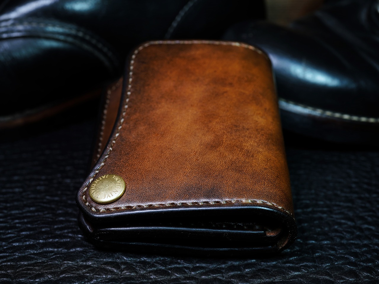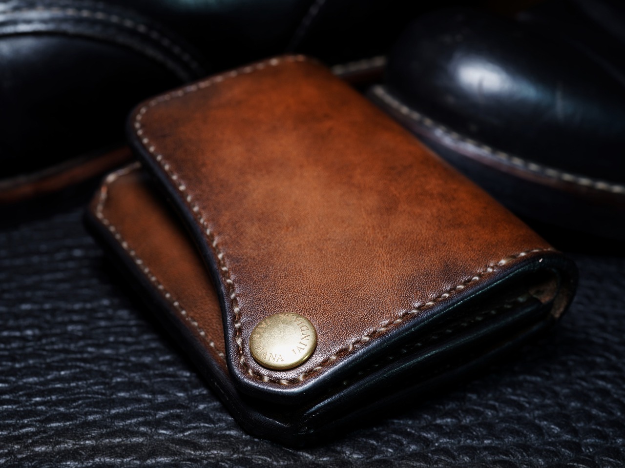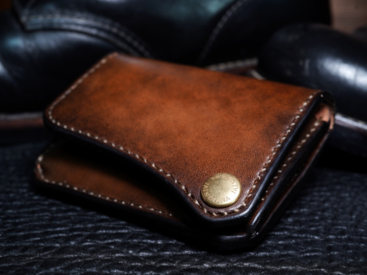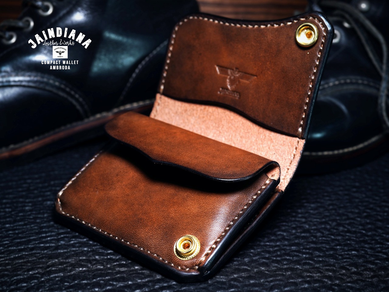 AMBRODA(アンブローダ)モデルの手染めシリーズ。手染めによりビンテージ感あるブラウンに染め上げられたサドルレザーが日常に極上のスパイスさをもたらすコンパクトウォレット。デザイン性と使い易さを兼ね備えた革財布。