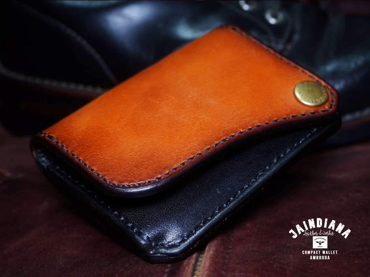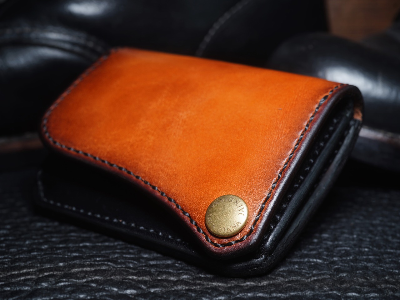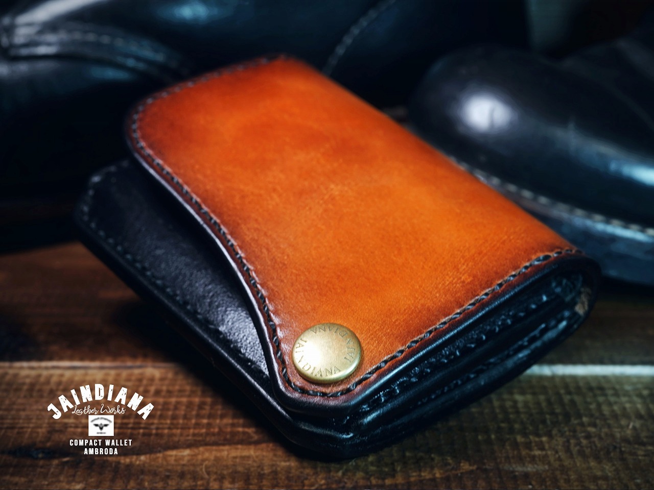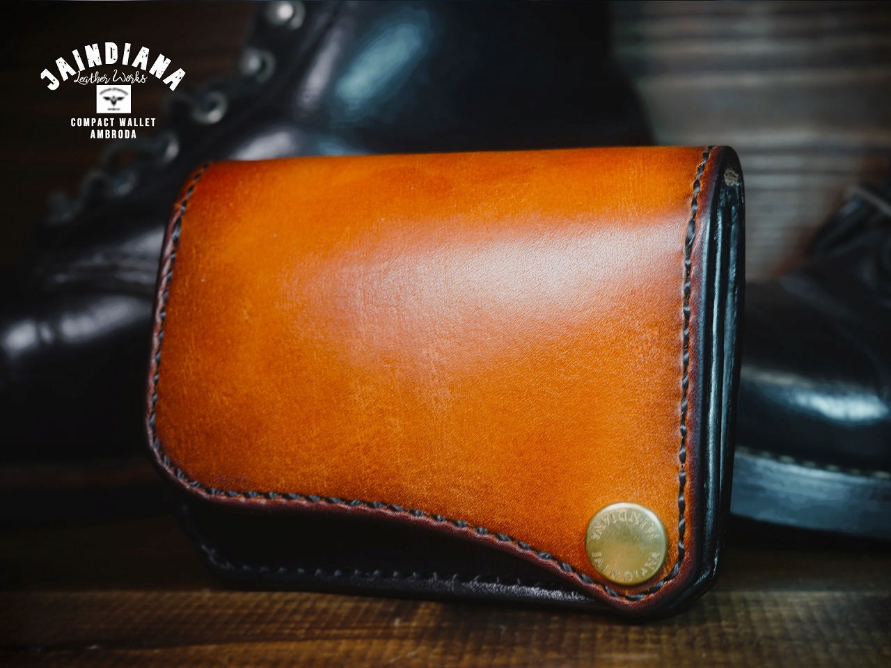 AMBRODA(アンブローダ)モデルの手染めシリーズ。手染めによりビンテージ感あるライトブラウンに染め上げられたサドルレザーとブラックサドルレザーのコンパクトウォレット。デザイン性と使い易さを兼ね備えた革財布。