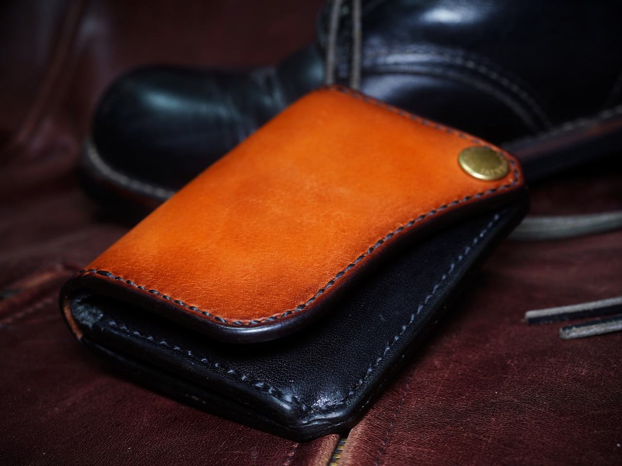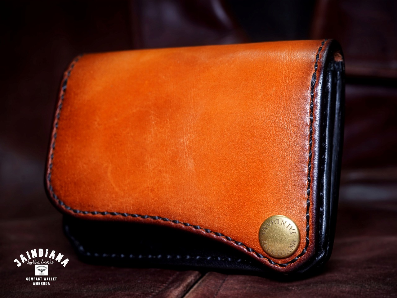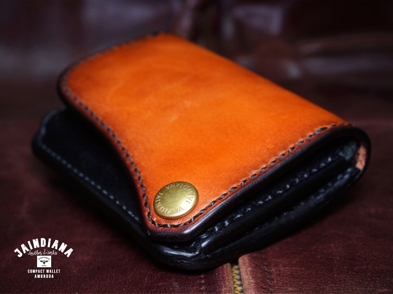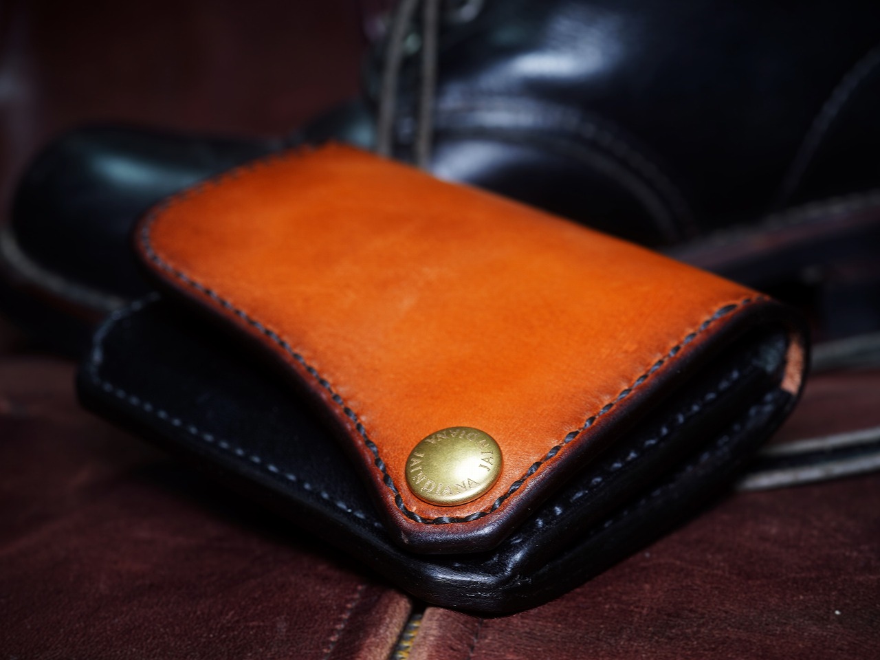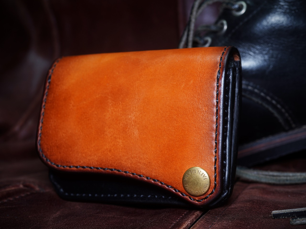 AMBRODA(アンブローダ)モデルの手染めシリーズ。手染めによりビンテージ感あるライトブラウンに染め上げられたサドルレザーとブラックサドルレザーのコンパクトウォレット。デザイン性と使い易さを兼ね備えた革財布。