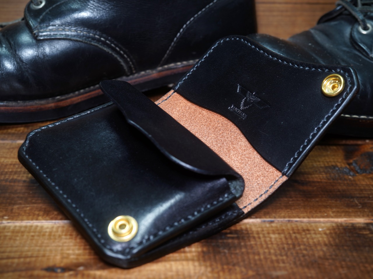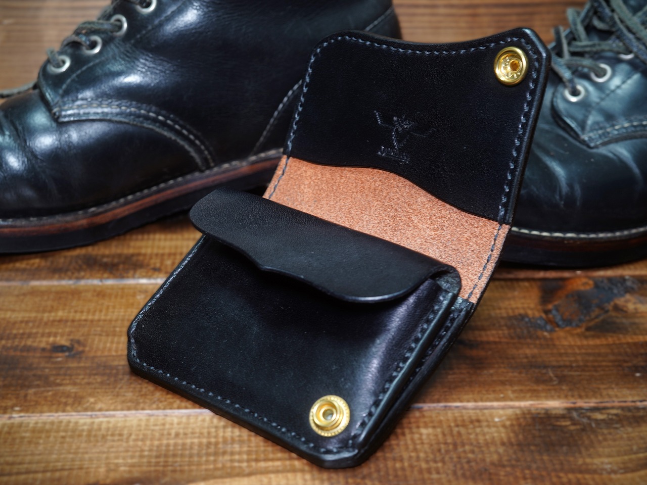 ブラックサドルレザーで構成された内装フロントに配置したコインケース部にはホックレスのフラップを装備。スムーズなフラップ開閉機能により、コインの出し入れがしやすいサドルレザーコンパクトウォレット。