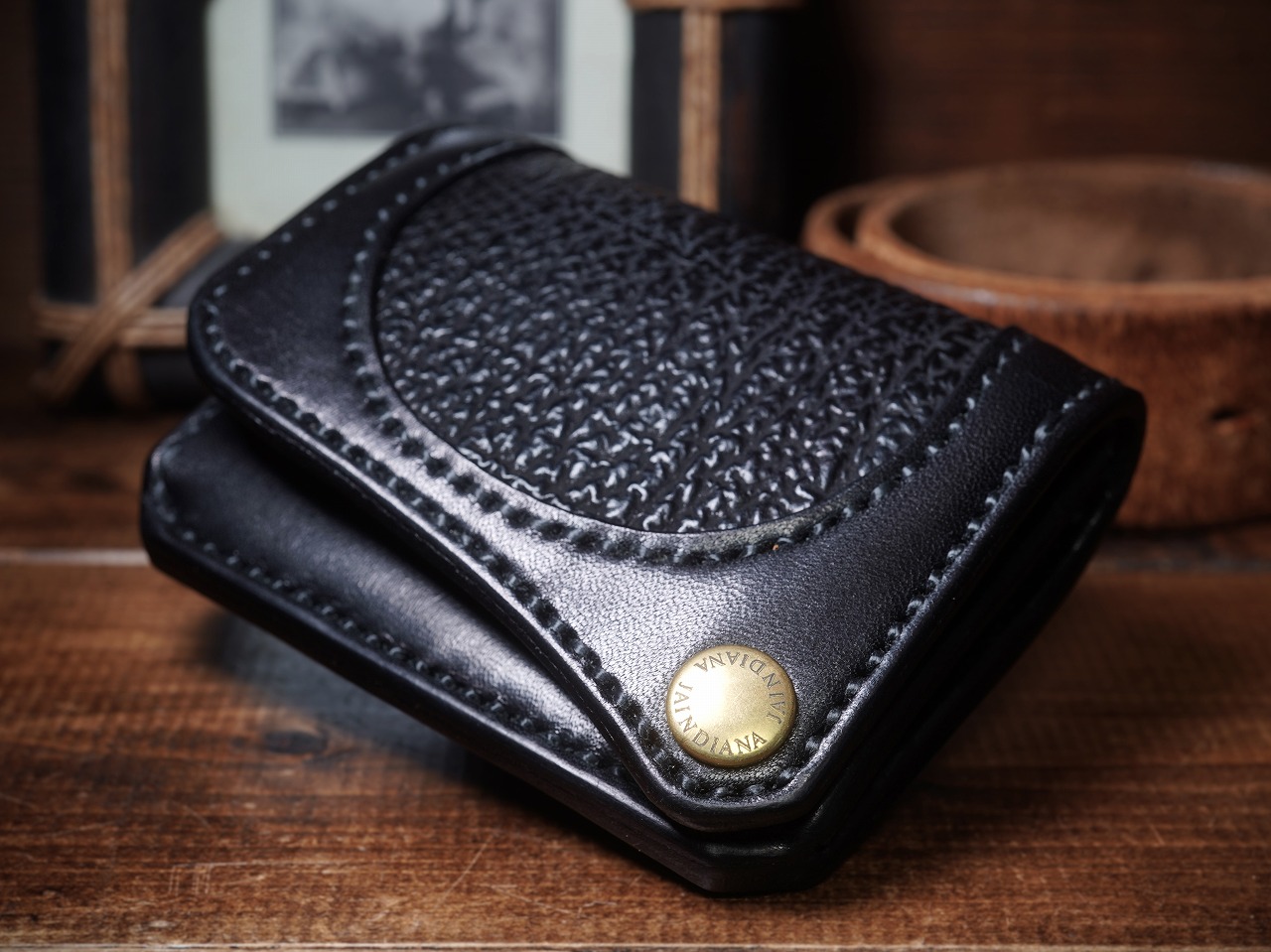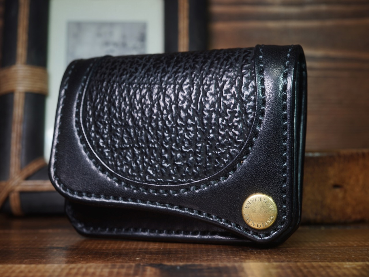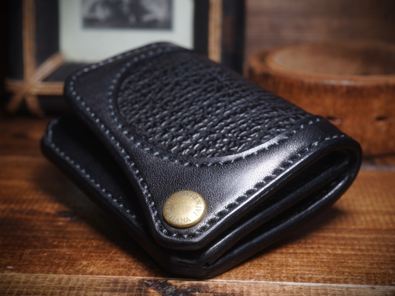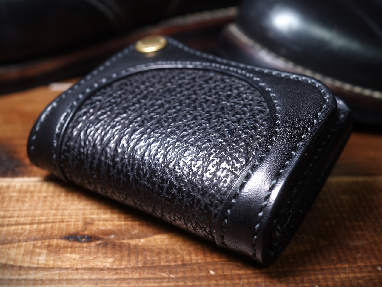 ブラックサドルレザーにシャークスキン(鮫革)をインレイしたコンパクトウォレット。しなやかな肌触りでありながら丈夫な、鮫革でしか味わえない魅力が溢れるデザイン性と使い易さを兼ね備えたコンパクトウォレット。