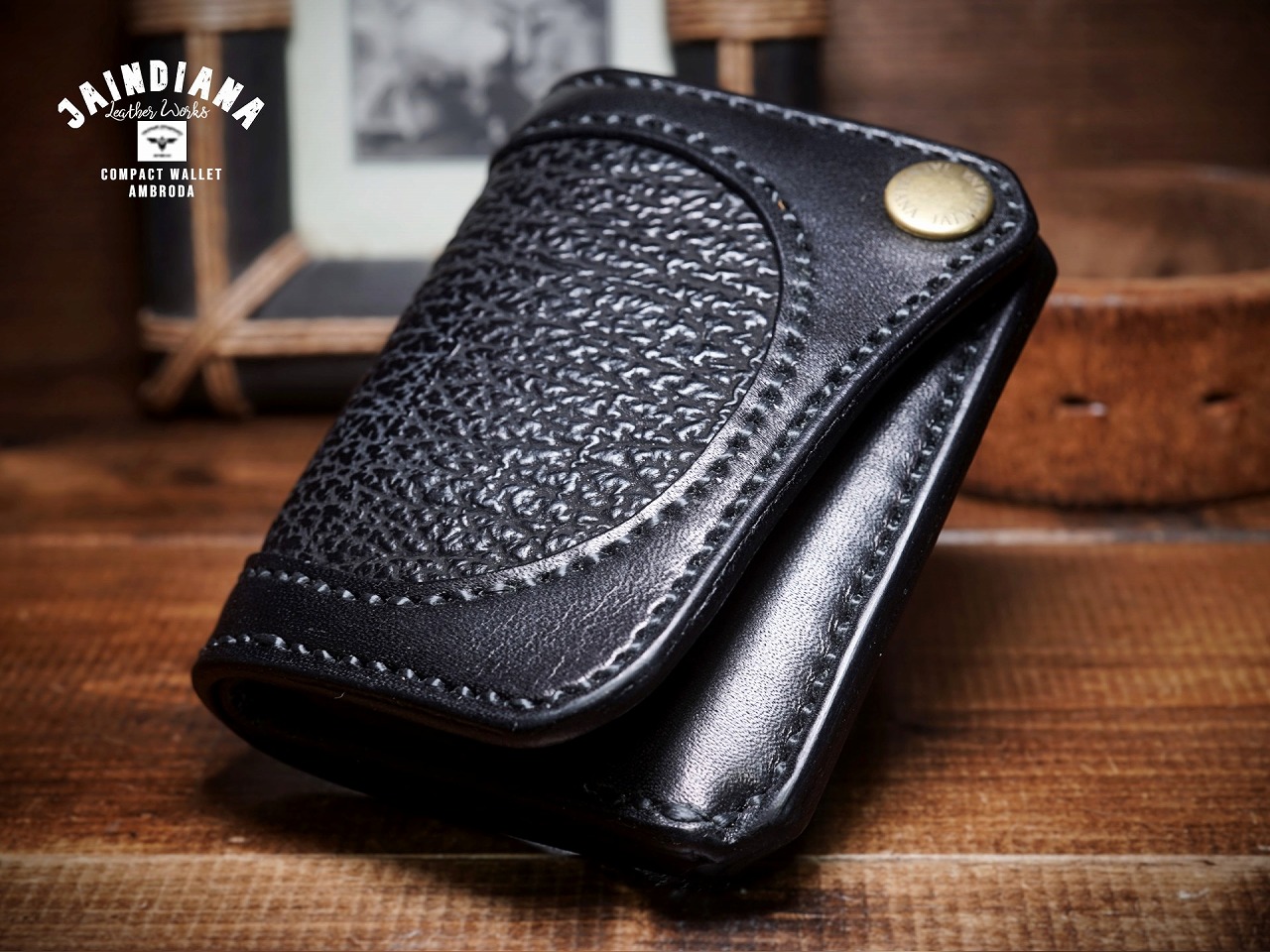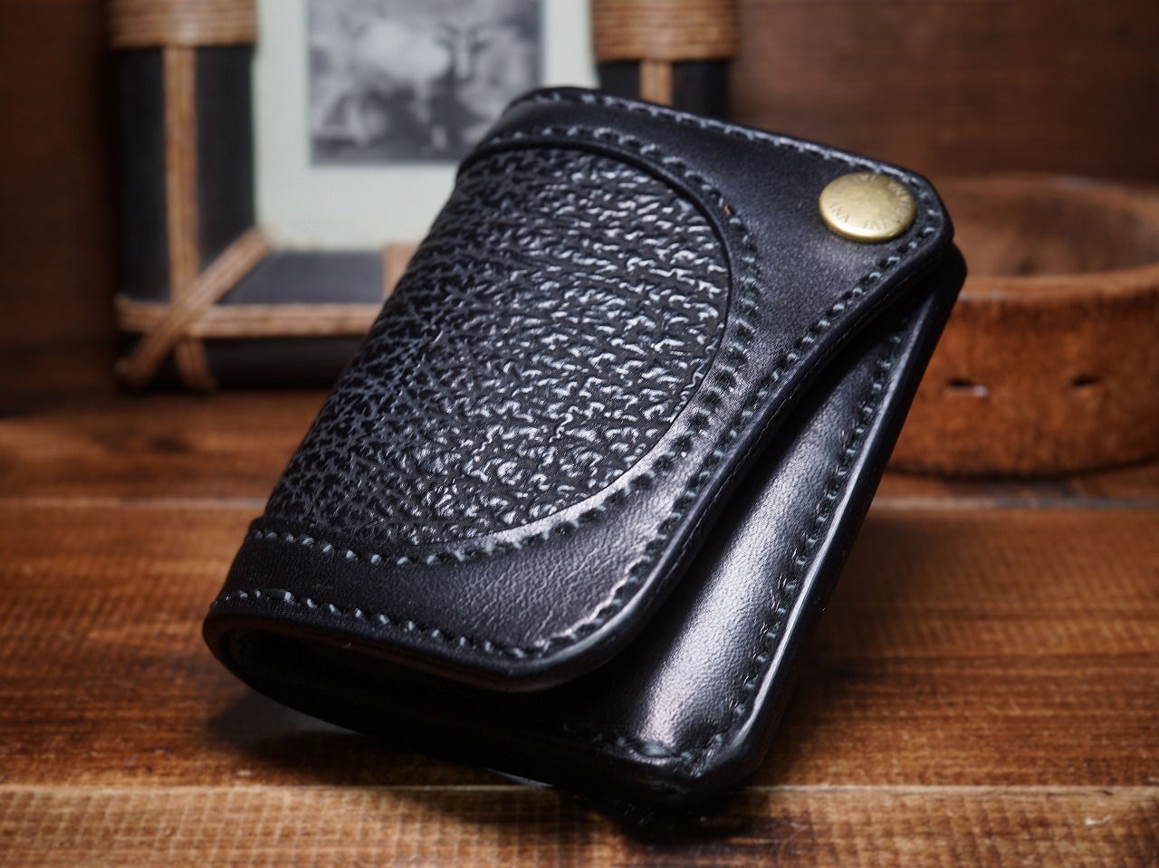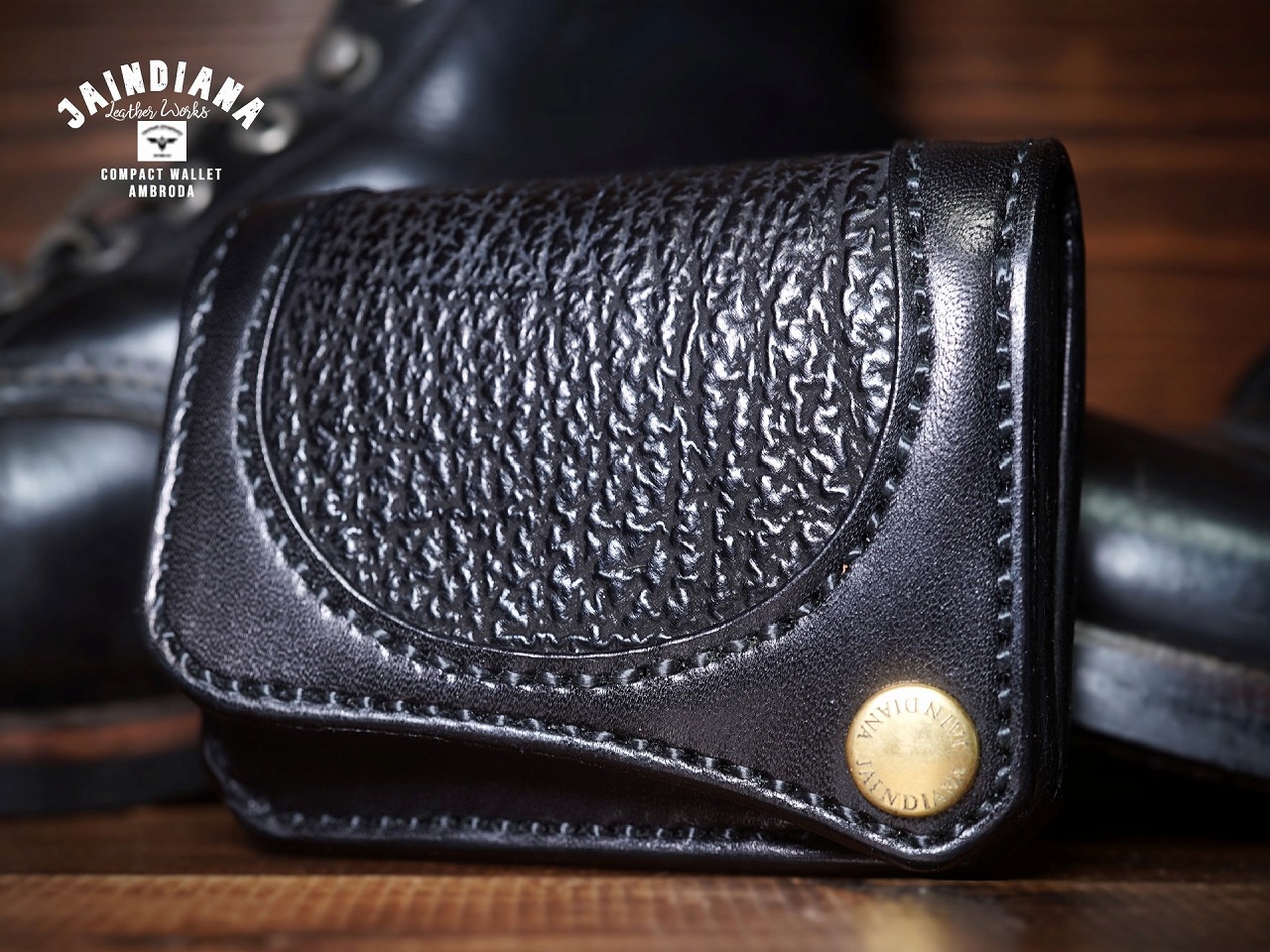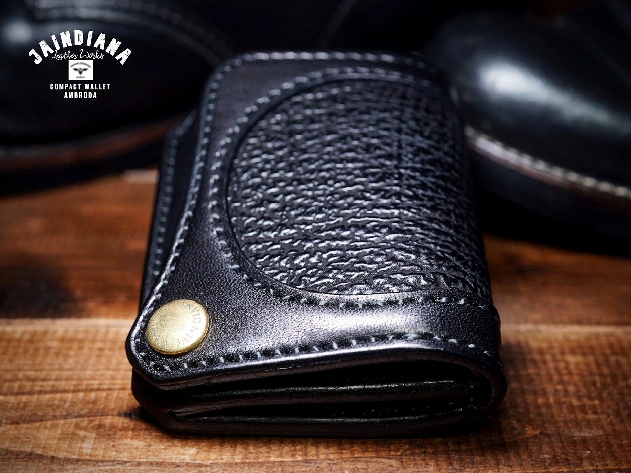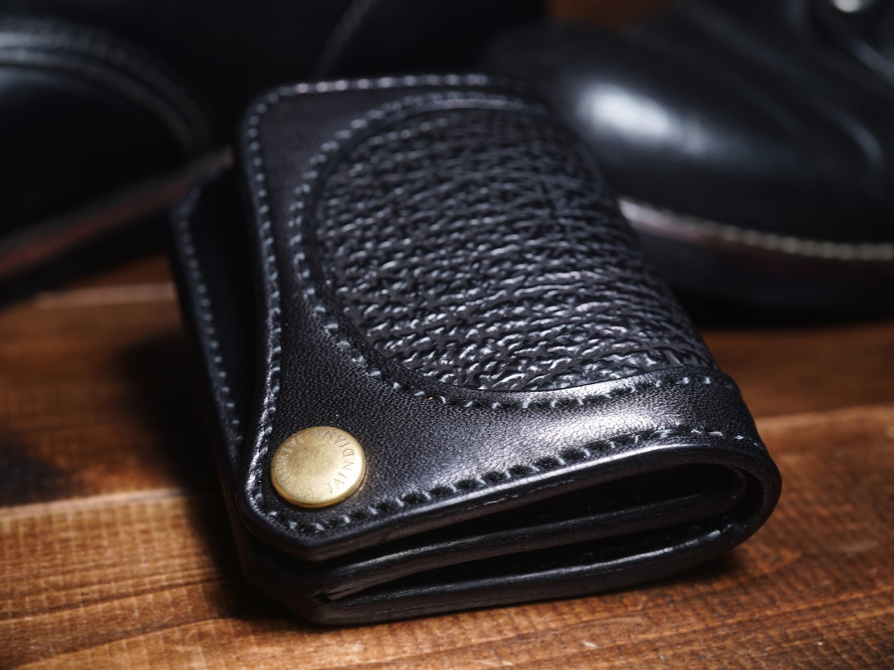 ブラックサドルレザーにシャークスキン(鮫革)をインレイしたコンパクトウォレット。しなやかな肌触りでありながら丈夫な、鮫革でしか味わえない魅力が溢れるデザイン性と使い易さを兼ね備えたコンパクトウォレット。