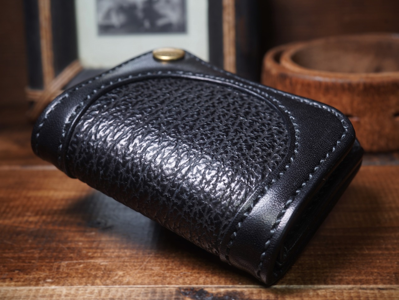 ブラックサドルレザーにシャークスキン(鮫革)をインレイし黒で統一された外観は、強く洗練された魂を感じさせます。