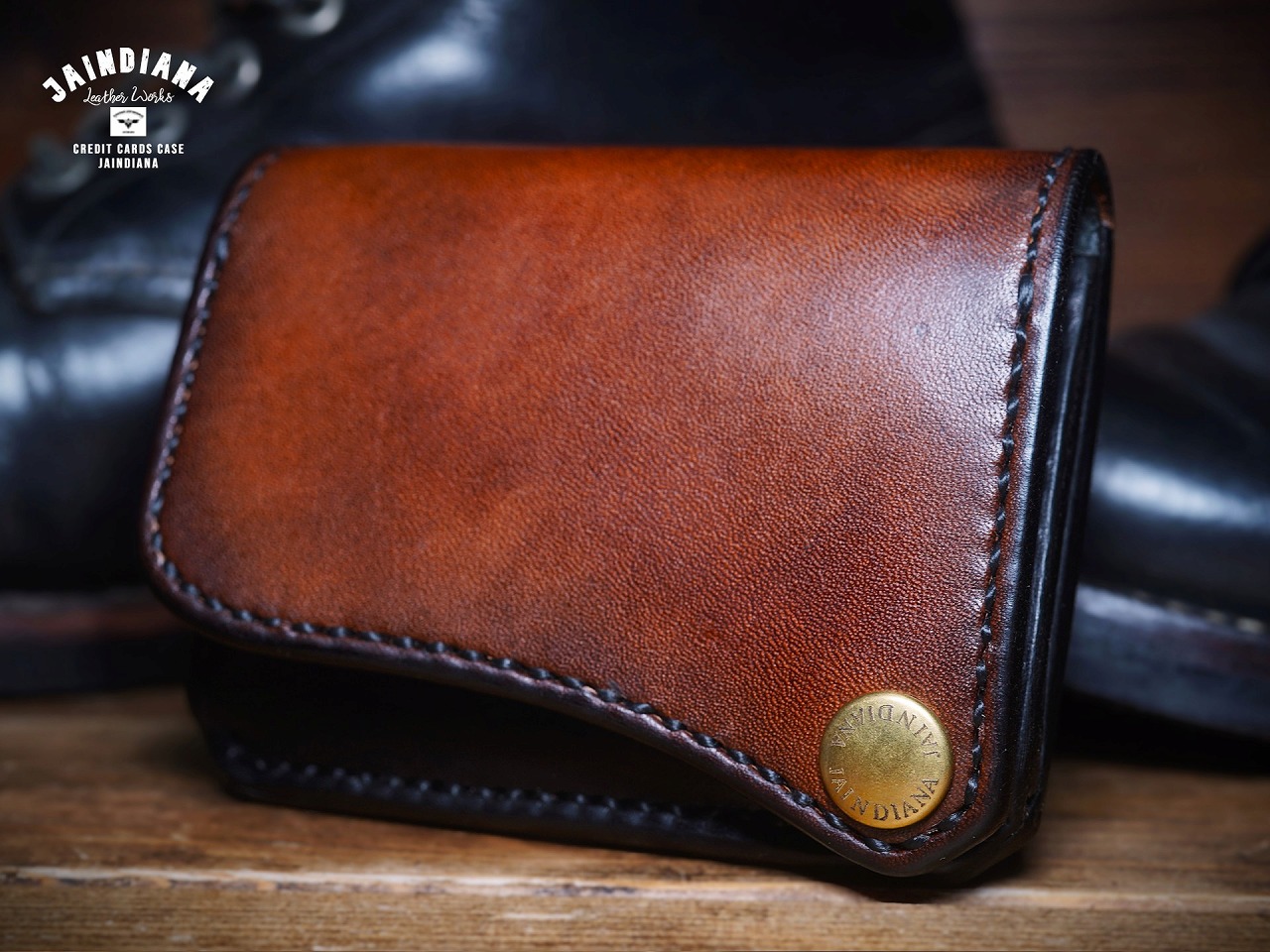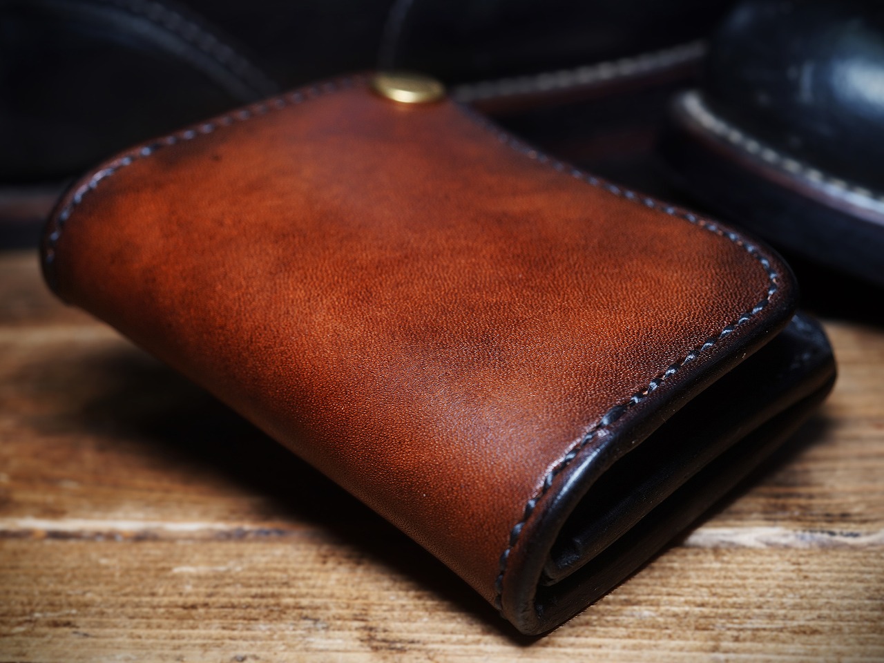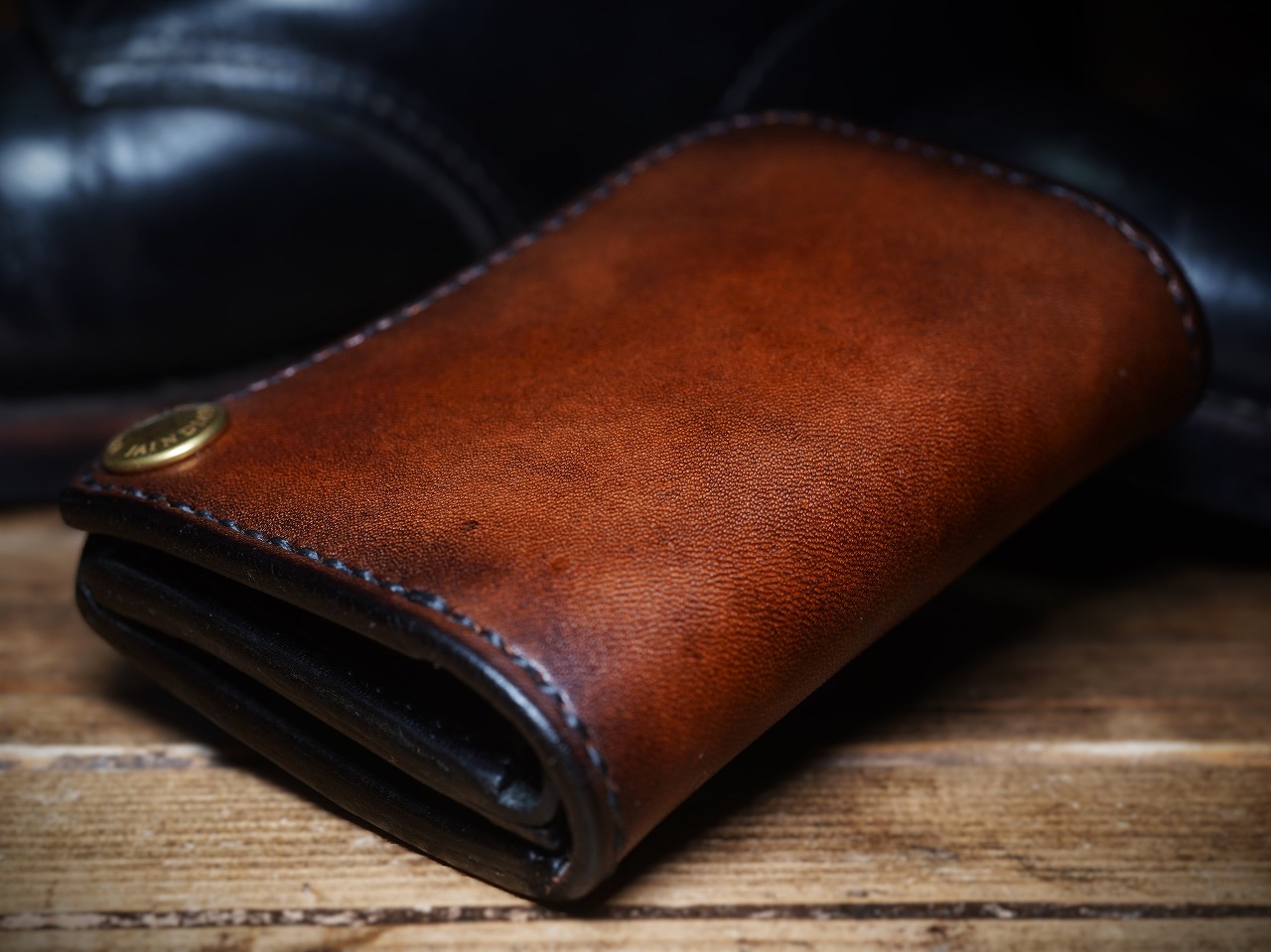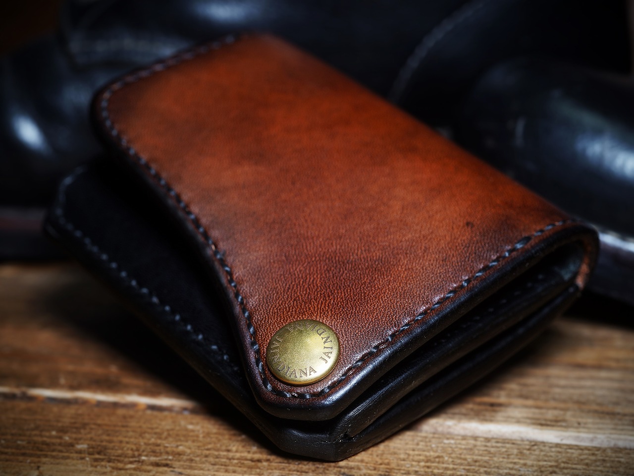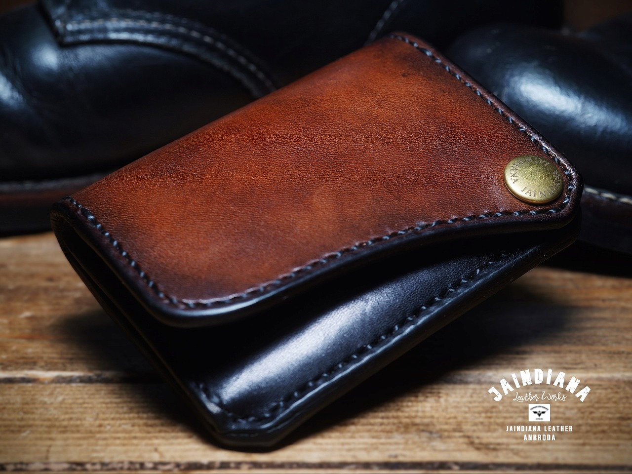 AMBRODA(アンブローダ)モデルの手染めシリーズ。手染めによりビンテージ感あるブラウンに染め上げられたサドルレザーとブラックサドルレザーのコンパクトウォレット。デザイン性と使い易さを兼ね備えた革財布。