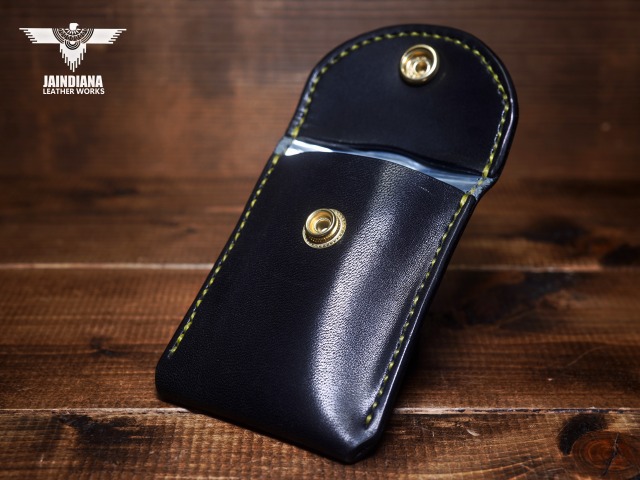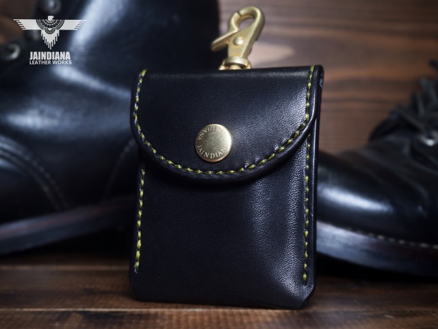 ブラックのサドルレザーにイエローのステッチがお洒落でクールな個性を放つ携帯灰皿。シンプルで洗練されたデザインと本物の革の質感が手に馴染む、ワンランク上の手縫いレザー携帯灰皿。