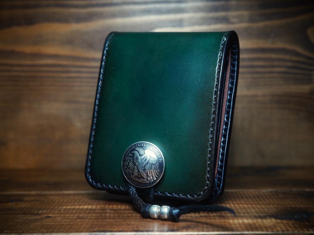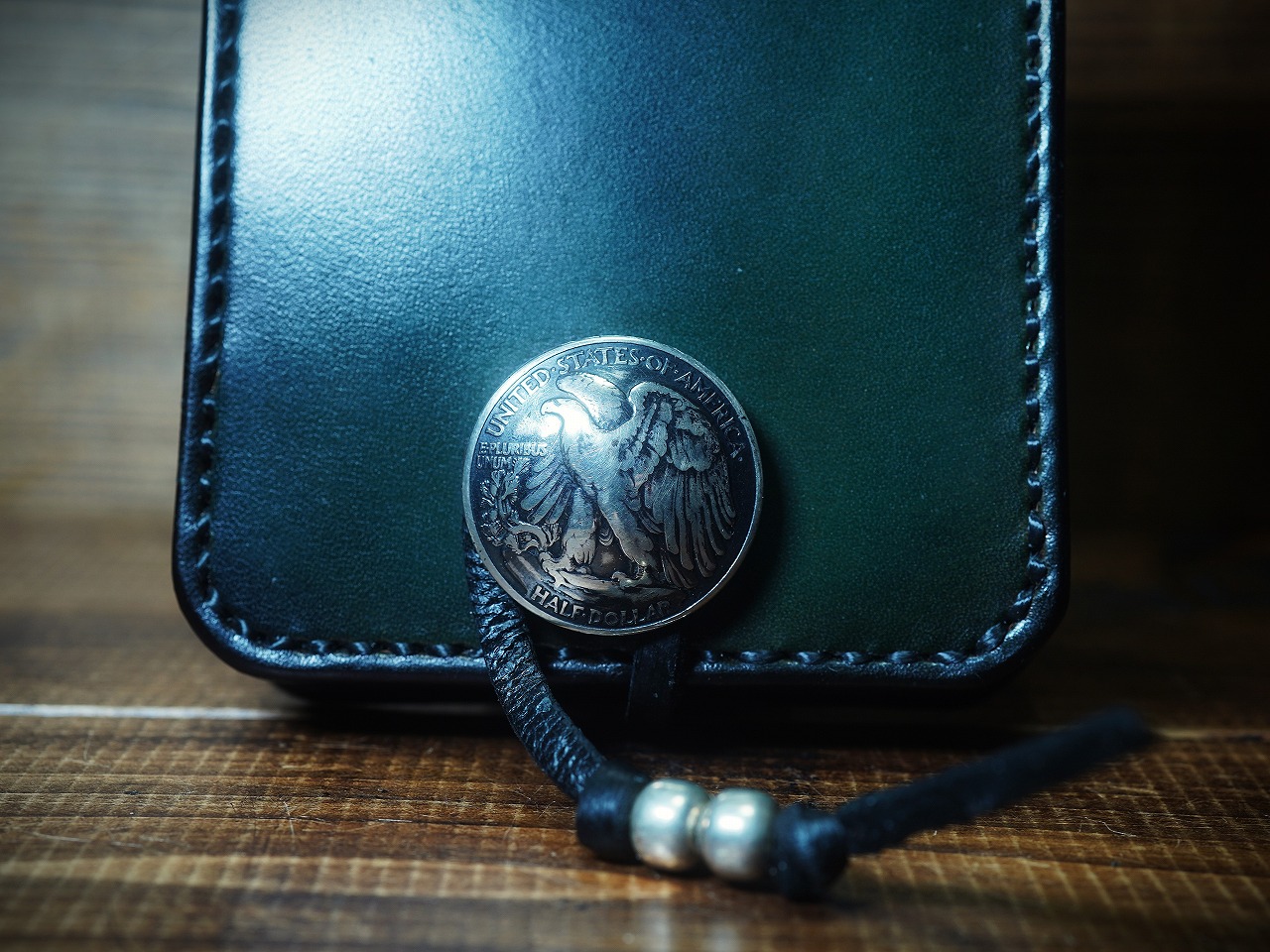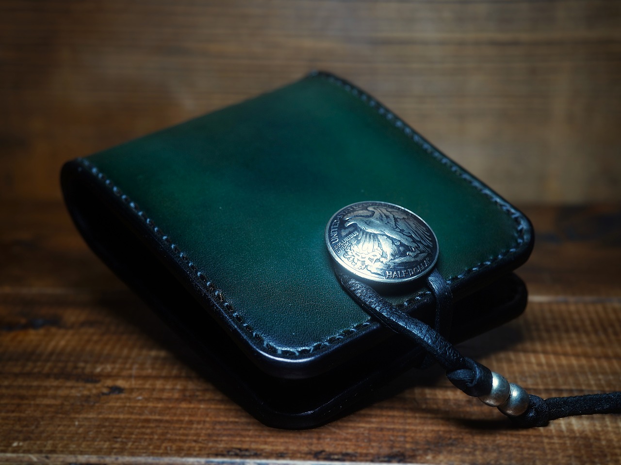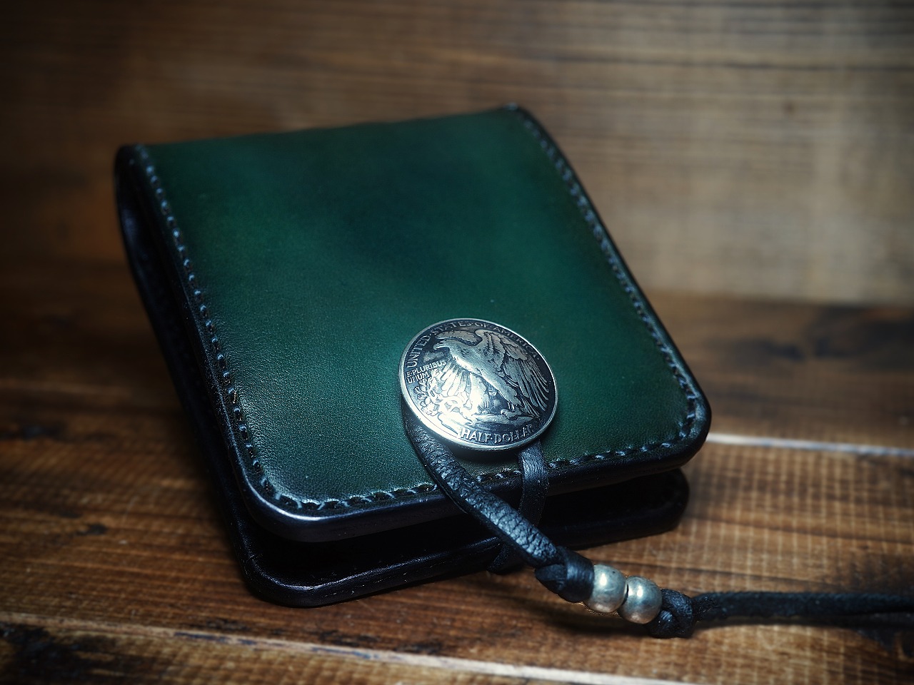 イーグルのシルバーコンチョがそのビンテージな深緑に崇高な命を吹き込み、更に昇華したハーフウォレット。
