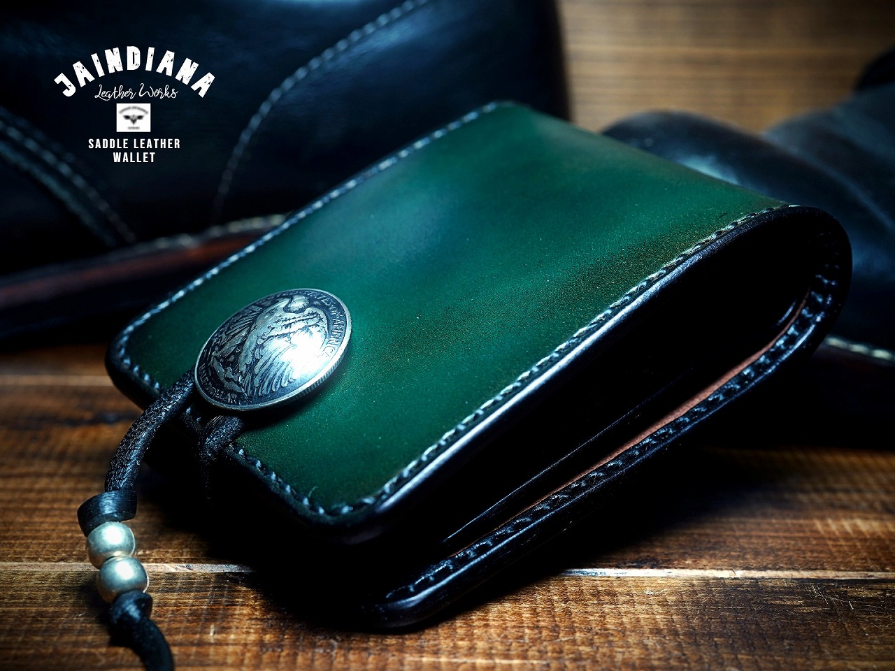 手染めにより、深みのある大人の緑、ビンテージダークグリーンに染め上げたサドルレザー。
