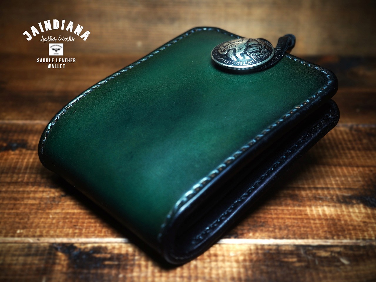 手染めによりビンテージな風合いをまとったダークグリーンに染め上げたサドルレザーのハーフウォレット。内装にはブラックサドルレザーを配置され、ネイティブな個性と落ち着いた雰囲気を合わせ持つ革財布。