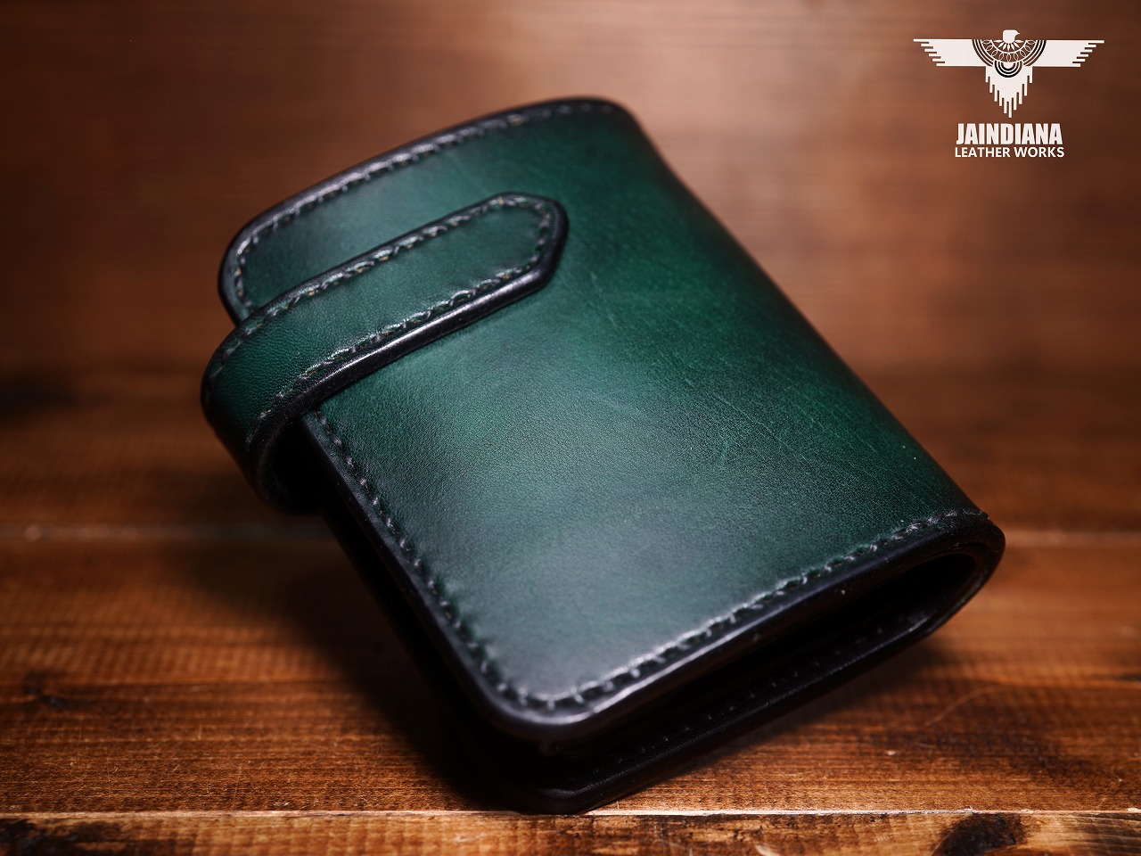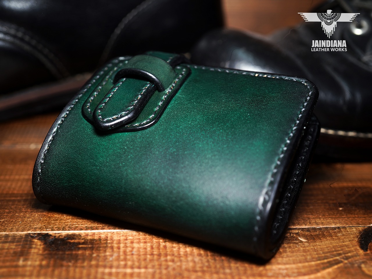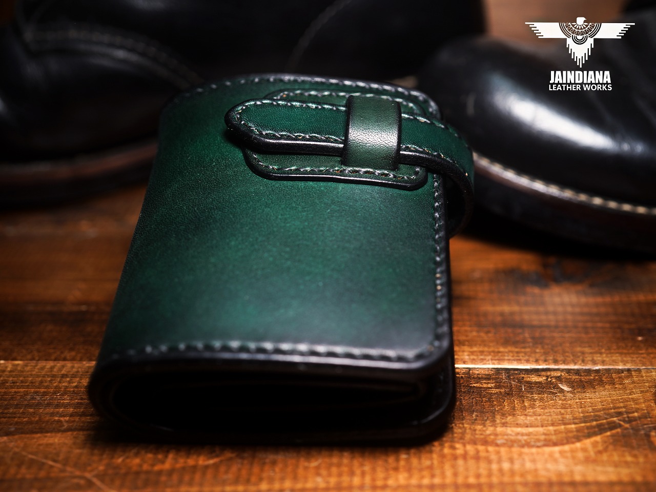 手染めによりビンテージな風合いをまとったダークグリーンに染め上げたサドルレザーのハーフウォレット。内装にはブラックサドルレザーを配置され、革のみで構成されたフラップデザインが個性と落ち着いた雰囲気を合わせ持つ革財布。