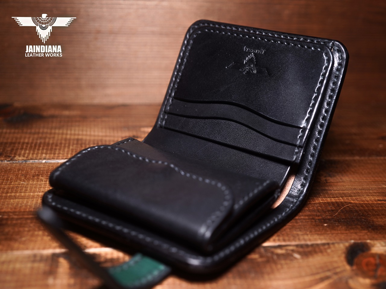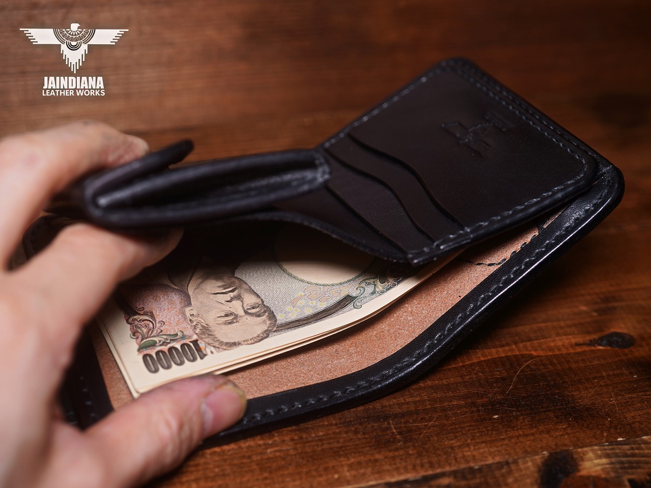装飾金具の付いていない、革のみで構築されたフラップデザインは、手縫い革財布の魅力をより一層引き立てます。