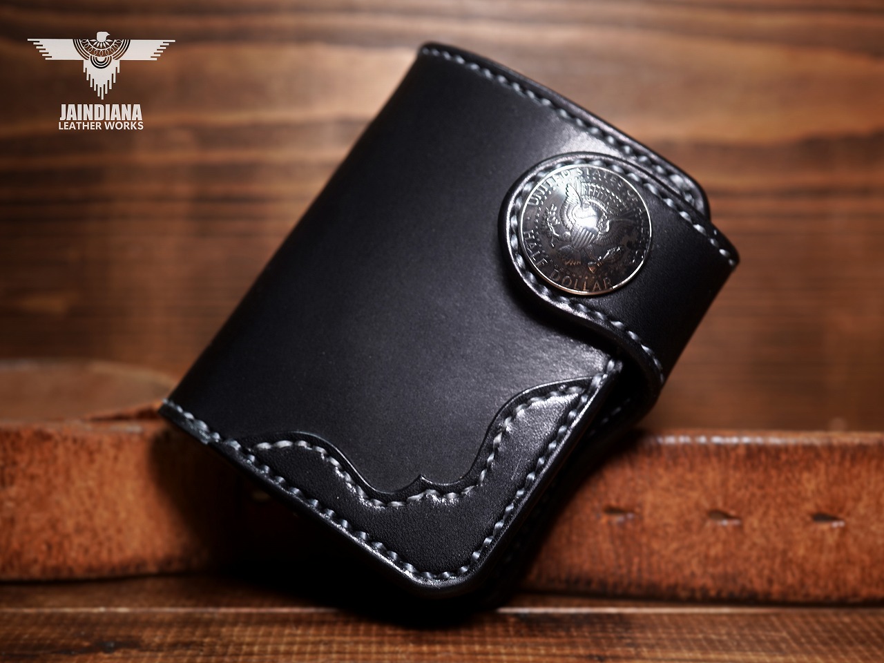 芯通しで染め付けられた深いブラックサドルレザーに白のステッチが映えるハーフウォレット。
