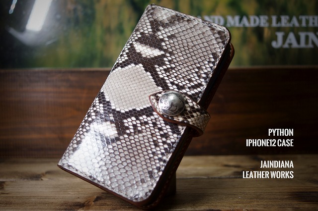 エネルギッシュなパイソンスキンを大胆に表側全面に使用し、手縫いで制作したiPhone12ケース。洗練されたデザインと肉厚な本物の革の武骨さが、他にはない個性と魅力を放つパワフルなレザーアイフォン12ケース。