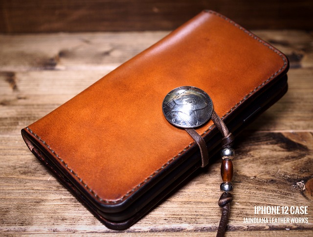 手染めによりソリッドでビンンテージなライトブラウンに染め上げられたサドルレザーのiPhone12ケース。洗練されたデザインと肉厚な本物の革の武骨さが手縫いで一針一針丁寧に構築され、他にはない個性と魅力を放つレザーアイフォン12ケース。