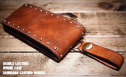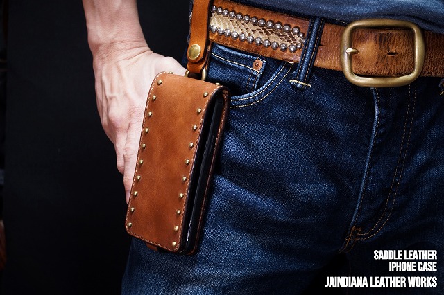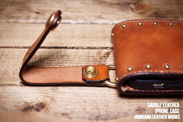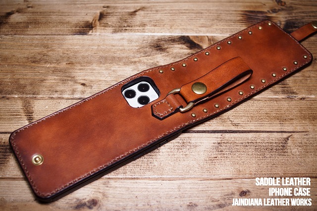 手染めによりソリッドでビンンテージなライトブラウンに染め上げられたサドルレザーのiPhone12ケース。一つ一つ打ち込まれた真鍮製スタッズがビンテージ感を加速させ、持ち歩くための利便性を兼ね備えたレザーアイフォン12ケース。
