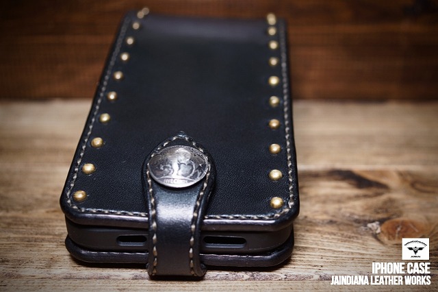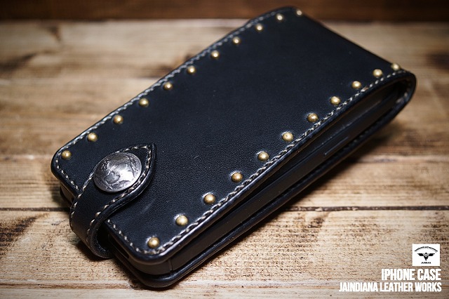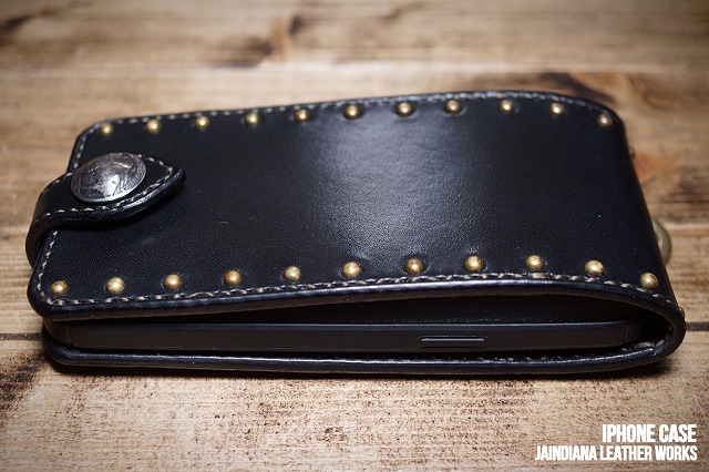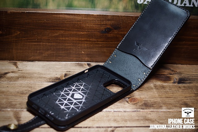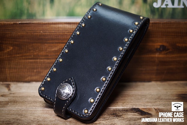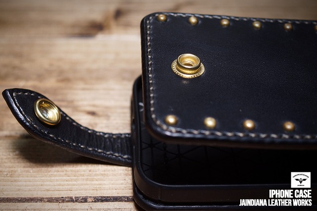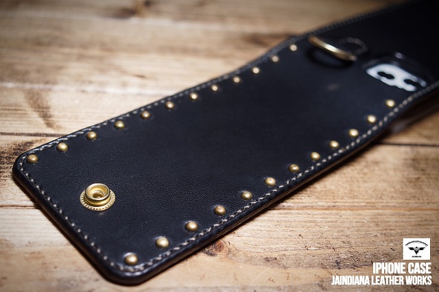 ブラックサドルレザーの重厚感が、日常に確かさをもたらす手縫いのiPhone12pro MAXケース。肉厚のサドルレザーに打ち込まれた真鍮製スタッズが更に骨太さを加速させた、他にはない個性と魅力を放つ、レザーアイフォン12pro MAXケース。