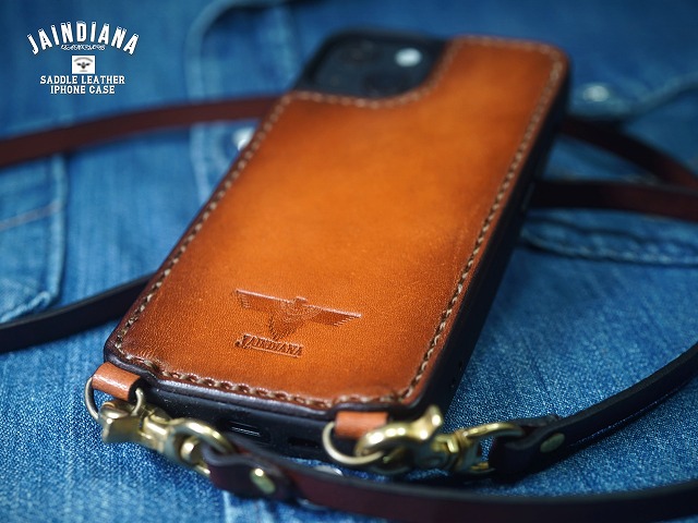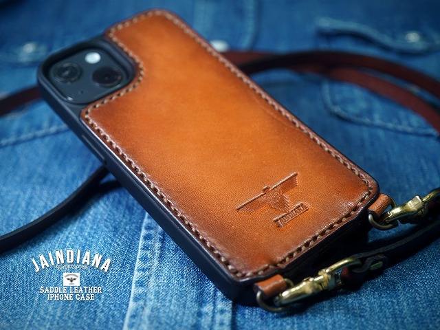 手染めによりビンテージ感あふれるライトブラウンに染め上げられたサドルレザーを使用したiPhone13ケース。ネックストラップ付きのスタイリッシュで使い勝手の良いシティー派スタイルが魅力のアイフォン13ケース。