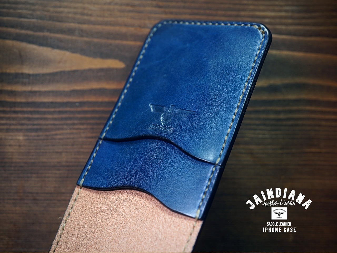 手染めにより各パーツごとに丁寧にブルーに染め上げられたサドルレザーのiPhoneケース。