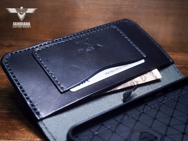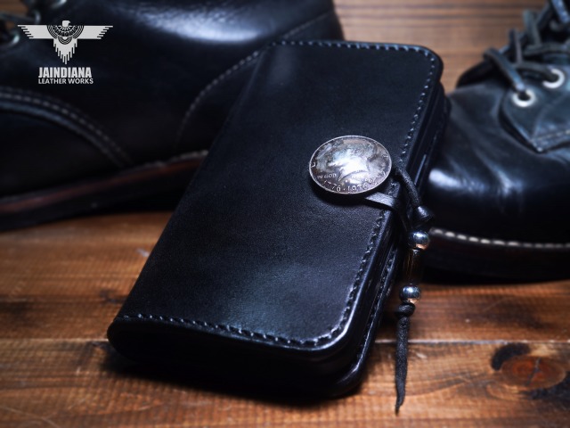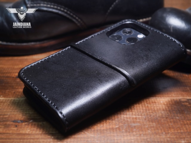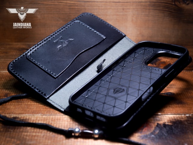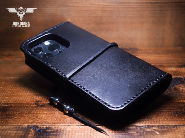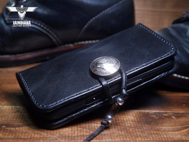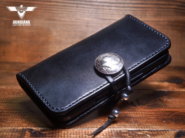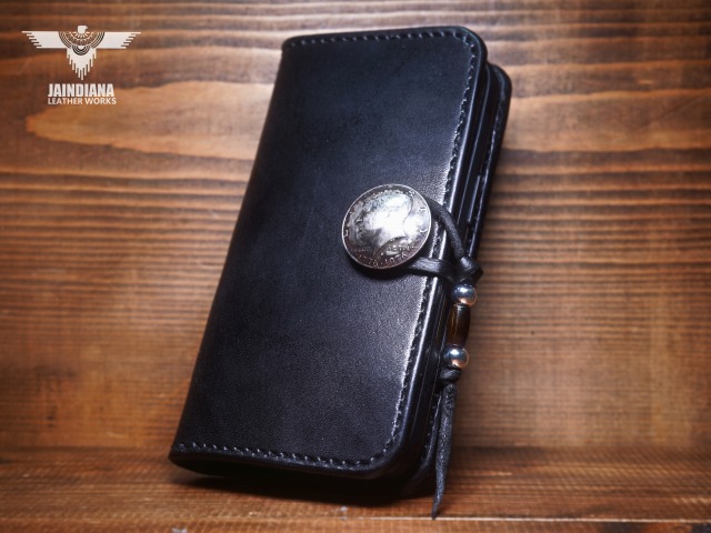 重厚感ある深いブラックカラーのサドルレザーが日常に確かさをもたらす手縫いのiPhone15ケース。コンチョにはアメリカ50セントケネディーコインを使用し、肉厚な本物の武骨さとスタイリッシュさを合わせ持つ、アイフォン15ケース。
