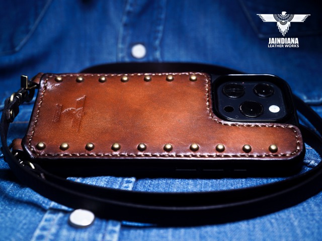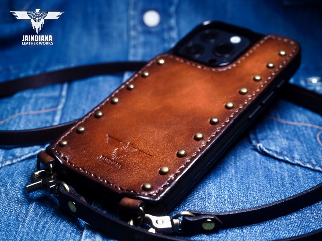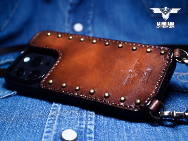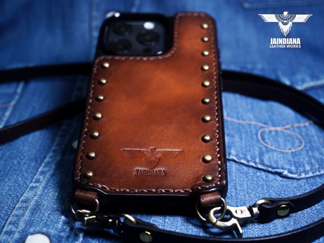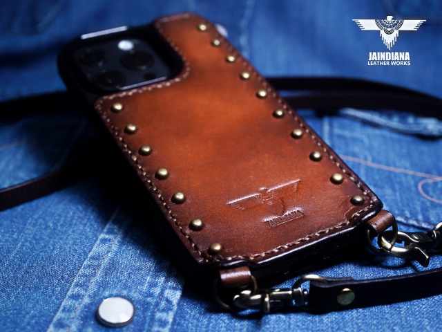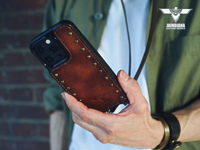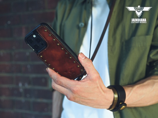 その革に真鍮製のラウンドスタッズを大胆に打ち込み、更に重厚感を増し、個性を身にまとった師玉のiPhoneケース