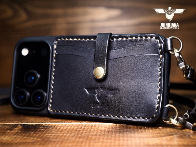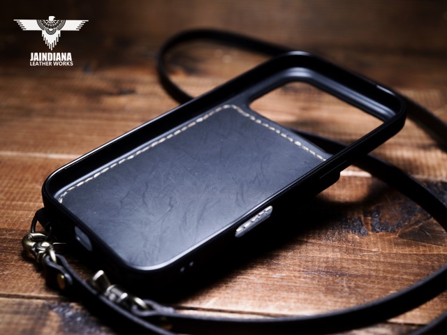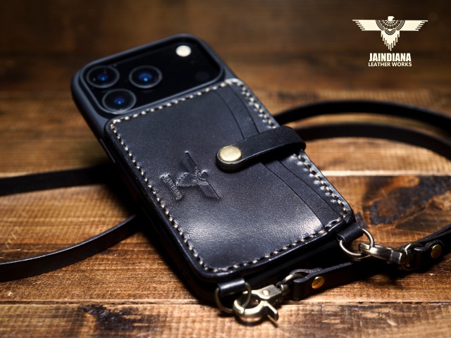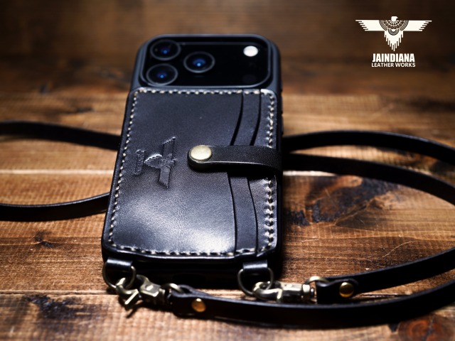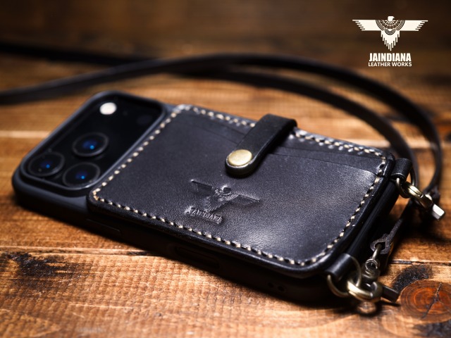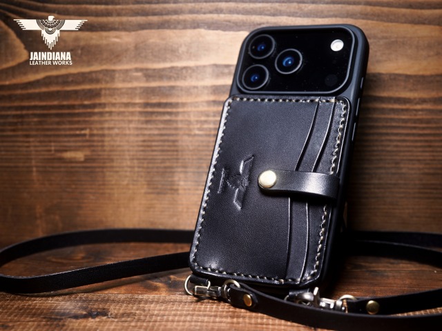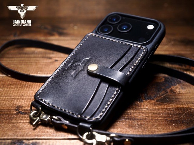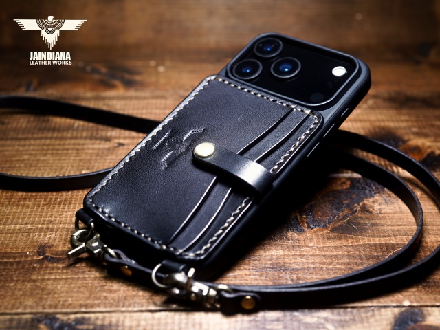 説得力あるブラックサドルレザーを使用したiPhone17Proケース。背面にカード入れを2段装備し、ネックストラップ付きのスタイリッシュで使い勝手の良いシティー派スタイルが魅力のアイフォンケース。