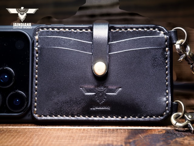 TPUケースの背面にブラックサドルレザーでカード入れを2段配置し、スタイリッシュな利便性と、本物の革の武骨さを合わせ持ったニュースタイルのiPhone17Proケース。