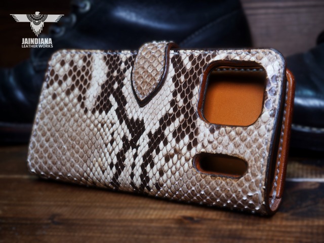 エネルギッシュなパイソンスキンを大胆に表側全面に使用し、手縫いで制作したiPhone17ProMAXケース。洗練されたデザインと肉厚な本物の革の武骨さが、他にはない個性と魅力を放つパワフルなレザーアイフォン17ProMAXケース。