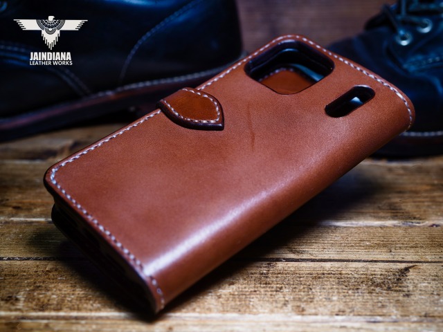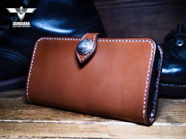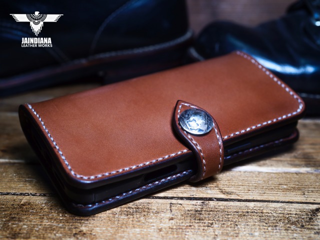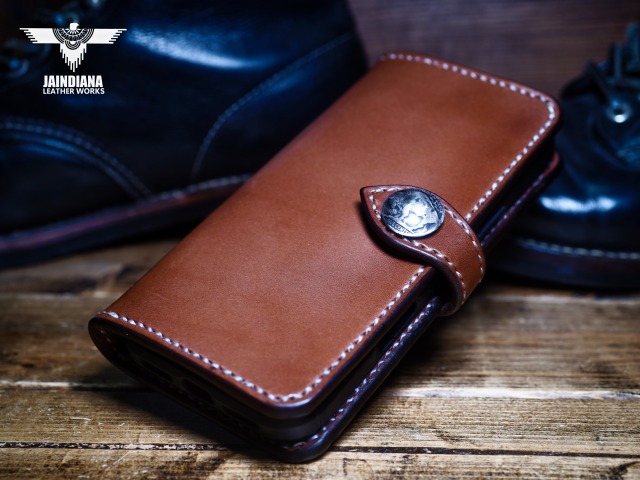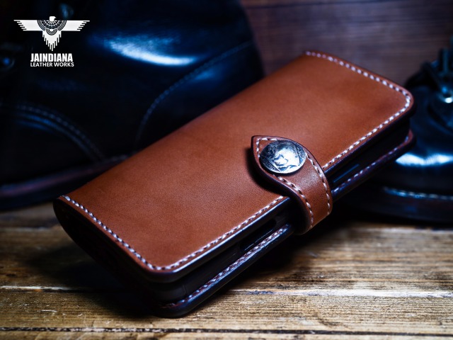 シックで重厚感あるブラウンカラーのサドルレザーが日常に確かさをもたらす手縫いのiPhone17ProMAXケース。コンチョにはアメリカ5セントコインを使用した手帳型のアイフォンケース。