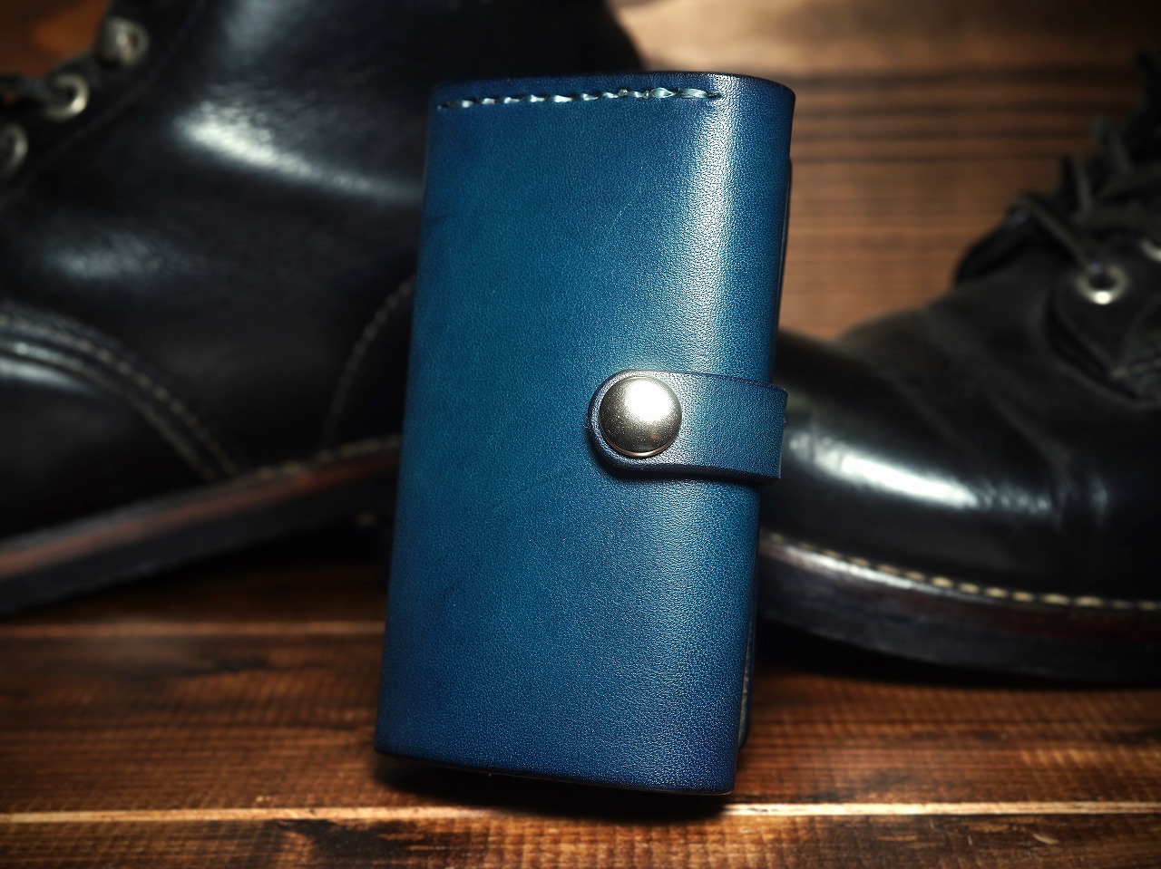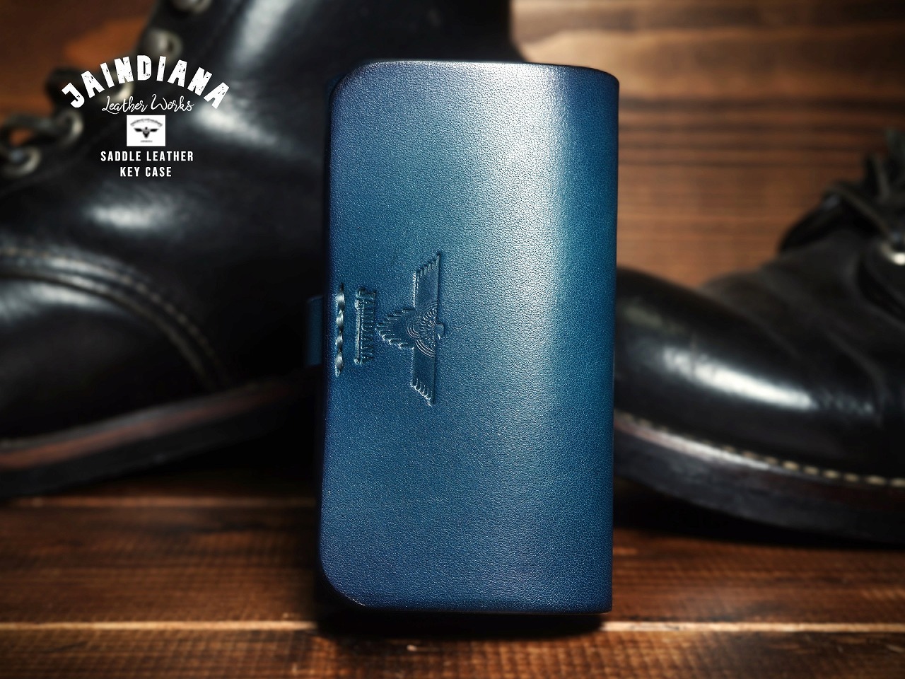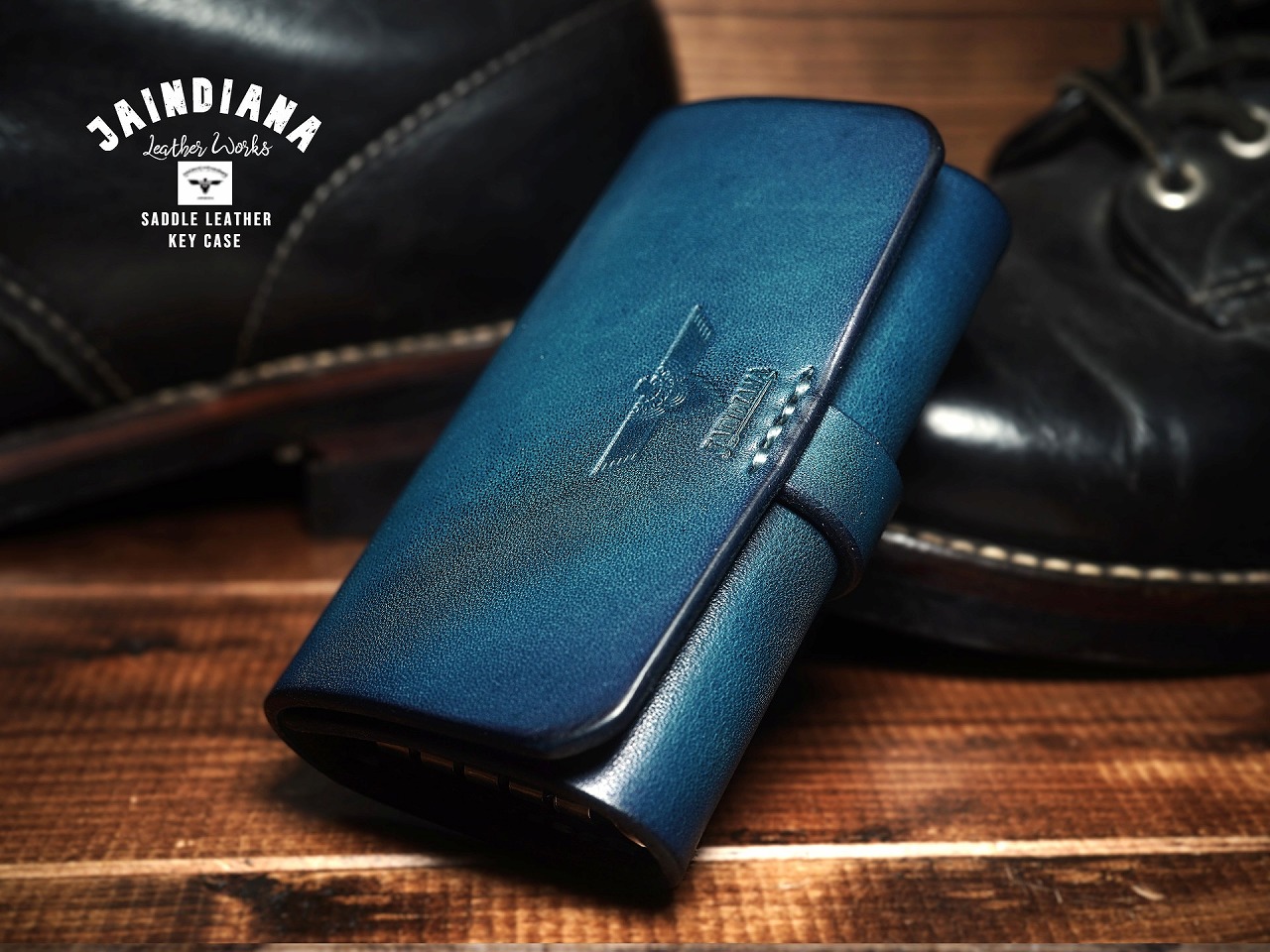 シンプルフォルムに発色のよいブルーカラーのサドルレザーが魅力のキーケース。一枚革の肉厚なサドルレザーが無骨さとスタイリッシュさを合わせ持つ、本物の存在感漂うJAINDIANAのサドルレザーキーケース。