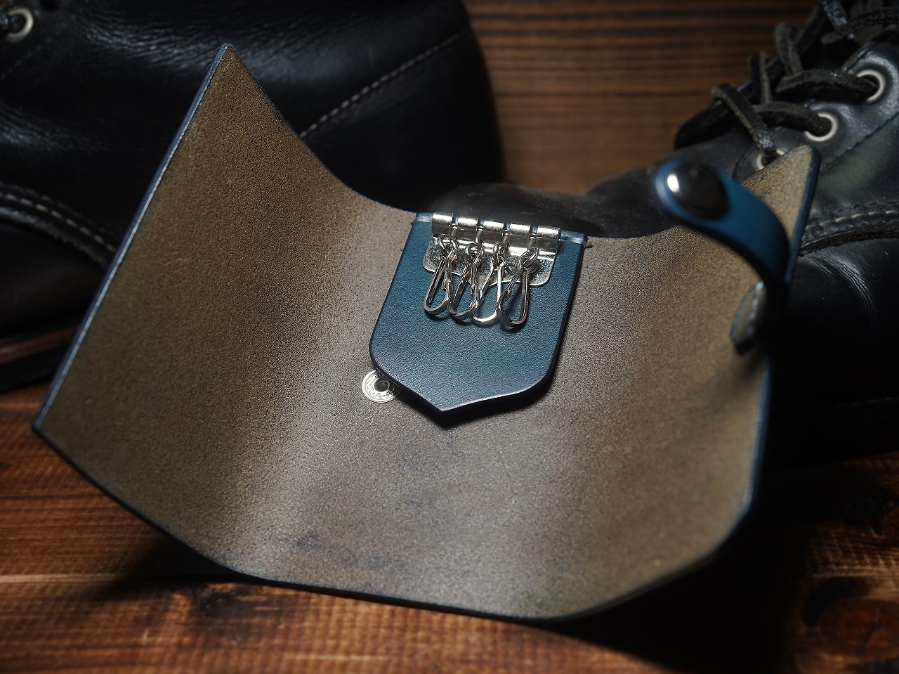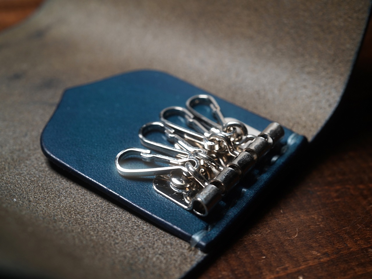 自然素材の風合いを残したまま発色のよいブルーに染められたサドルレザーが、シンプルな革造形にスタイリッシュでさりげない個性を感じさせるサドルレザーキーケース。