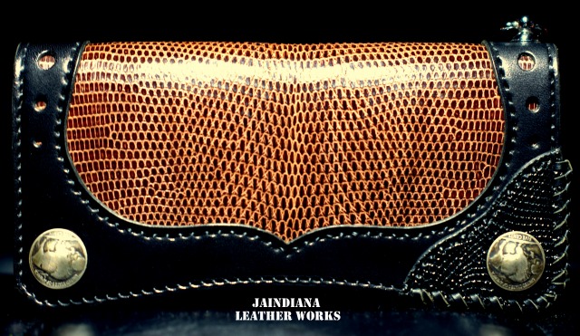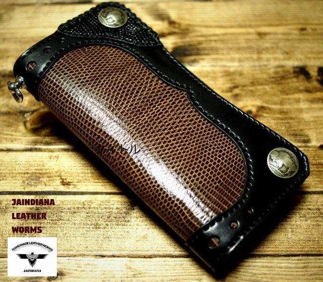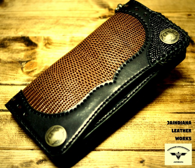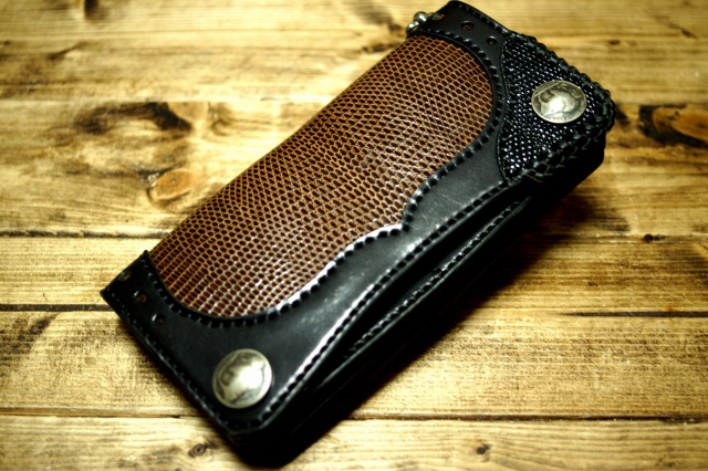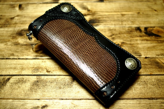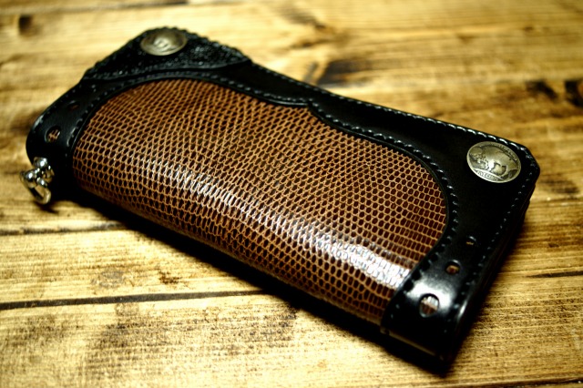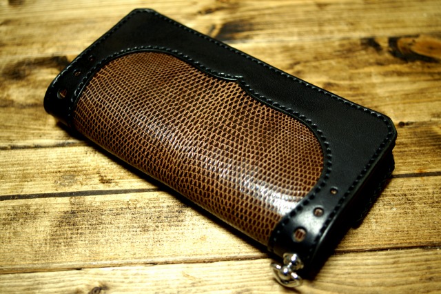 生命力あるリザードスキンをブラックサドルレザーに包み込み、屈強な手縫いで構築したこのウォレットのクールで凛とした存在感を味わって頂きたいです。