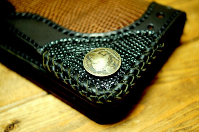| 材質 | 革・・・リザードスキン/栃木サドルレザー コンチョ・・・アメリカ5セントコイン・バッファロー |