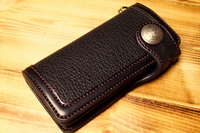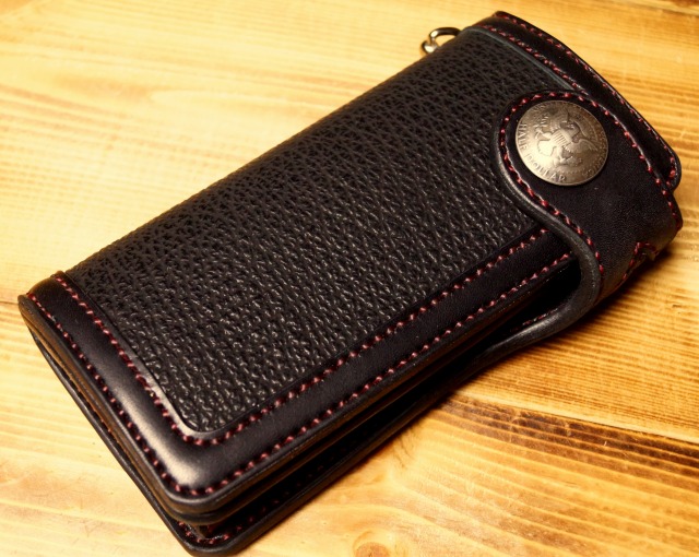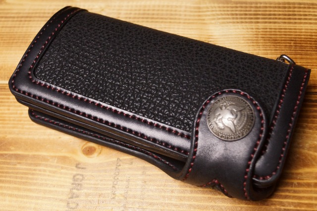 シャークスキン(鮫革)をブラックサドルレザーにインレイしたロングウォレット。シンプルなフォルムでありながらも深い存在感は鮫革ならではの魅力。パワフルでクールなバイカーズロングウォレット。