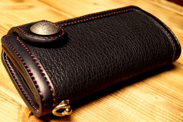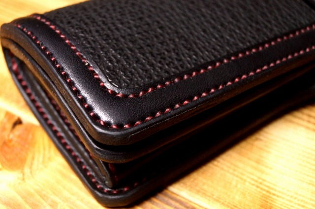 しなやかなシボが魅力的なシャークスキンを不変のブラックサドルレザーで包み込み、屈強な手縫いで構築したこのウォレットの強くて優雅な存在感を味わって頂きたいです。